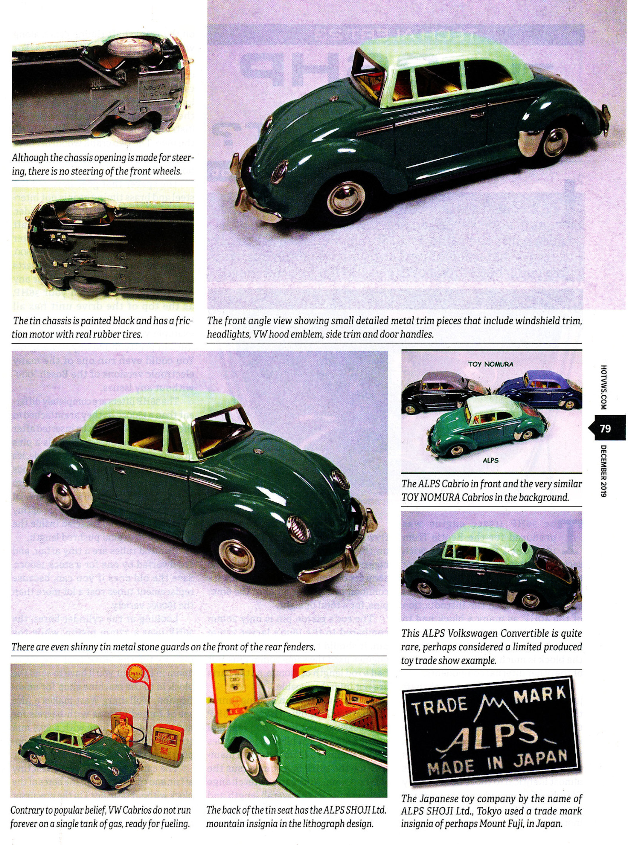 ALPS produced this very nice tin plate Volkswagen Convertible with the top up. Tin body is painted a medium green and there are metal trim pieces that include windshield trim, headlights, VW hood emblem, side trim and door handles.