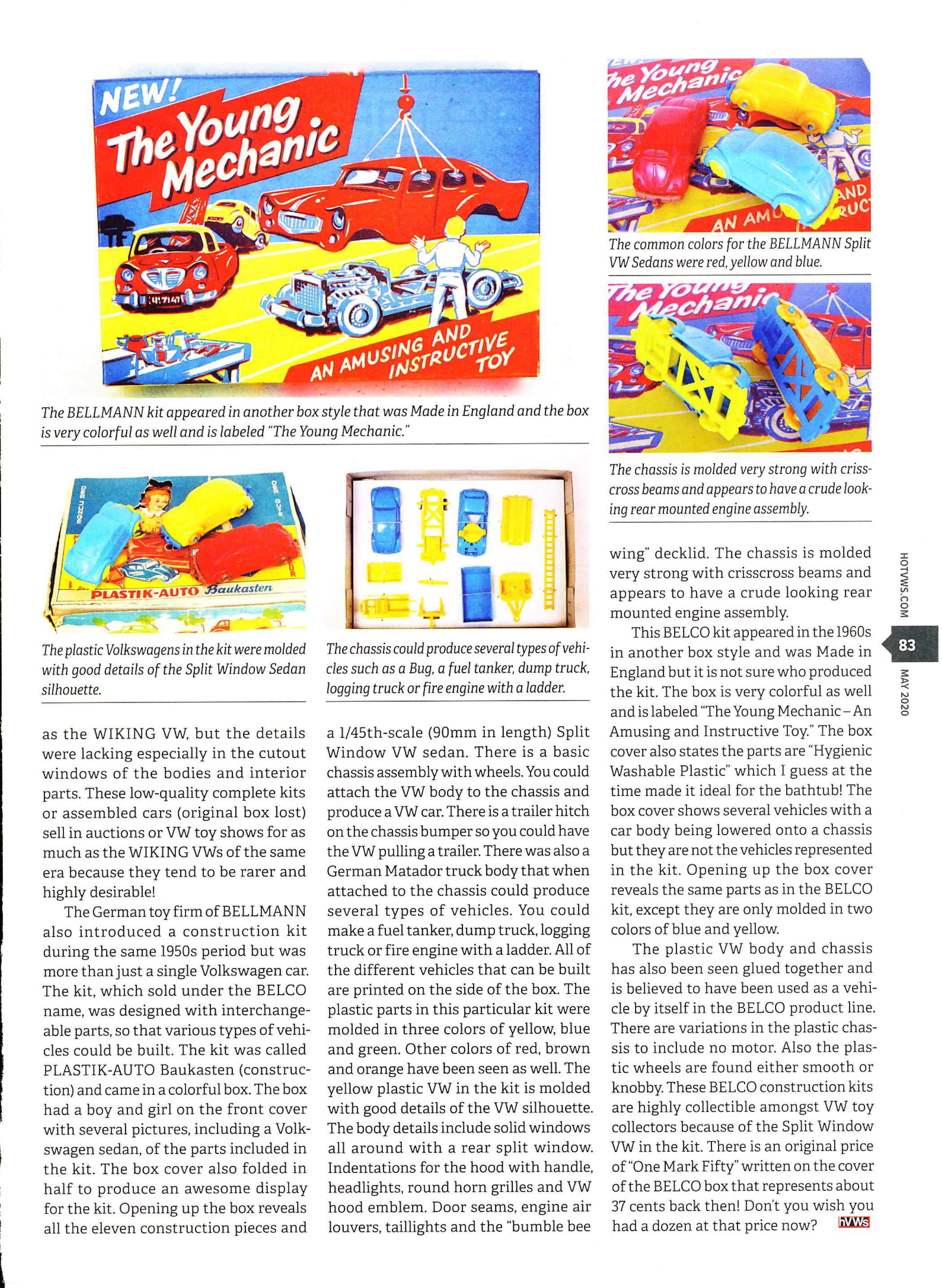 Belco introduced a construction kit during the same 1950s period but was more than just a single Volkswagen car. The kit, which sold under the Belco name, was designed with interchangeable parts so that various types of vehicles could be built. The kit was called PLASTIK-AUTO Baukasten (construction) and came in a colorful box.