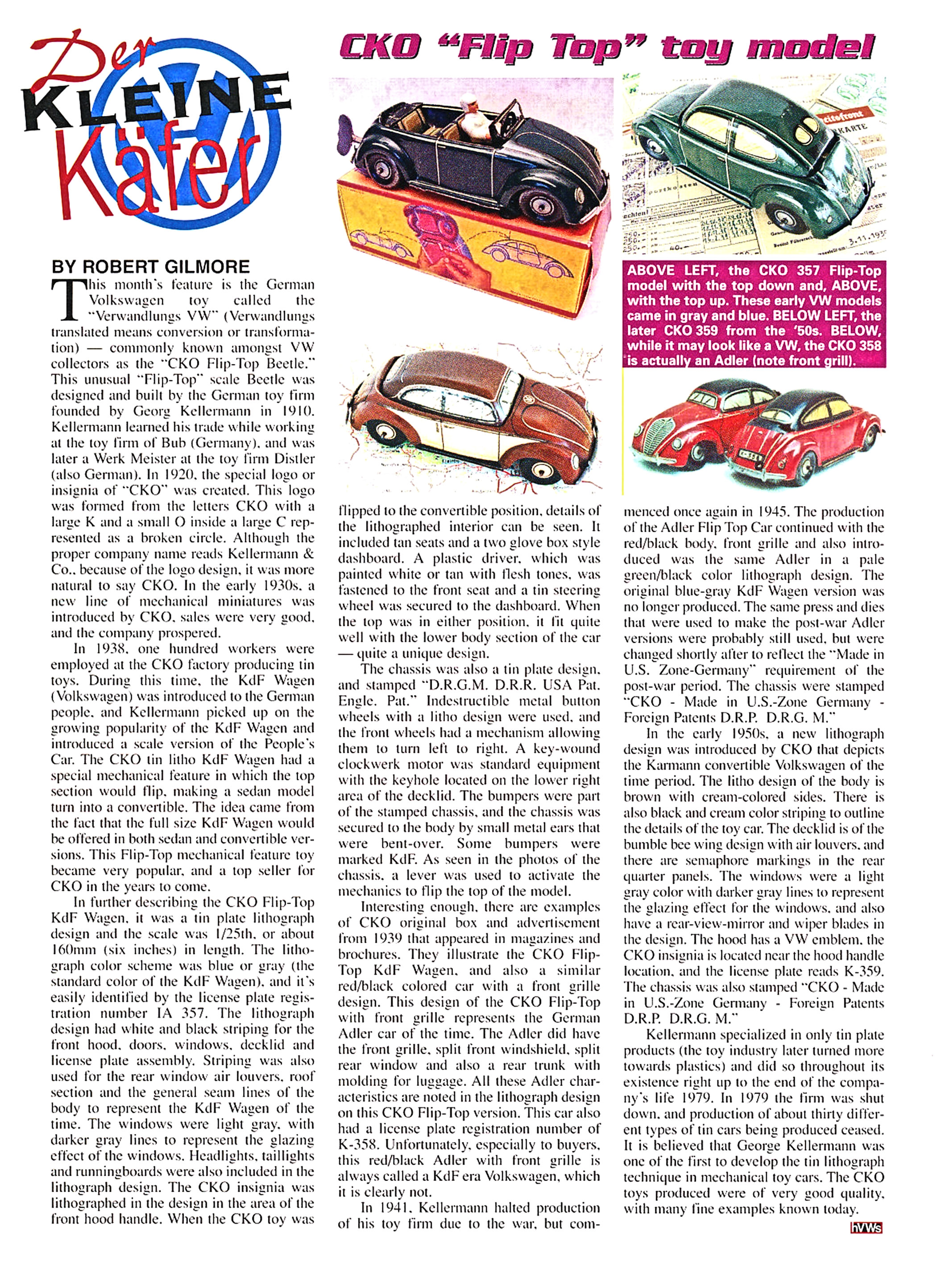 In further describing the CKO Flip Top KdF Wagen, it was of a tin plate lithograph design and the scale was 1/25th or about 160mm (6 ¼ inches) in length. The lithograph color scheme was a blue gray (the standard color of the KdF Wagen) and the CKO is easily identified by the license plate registration number IA 359.
