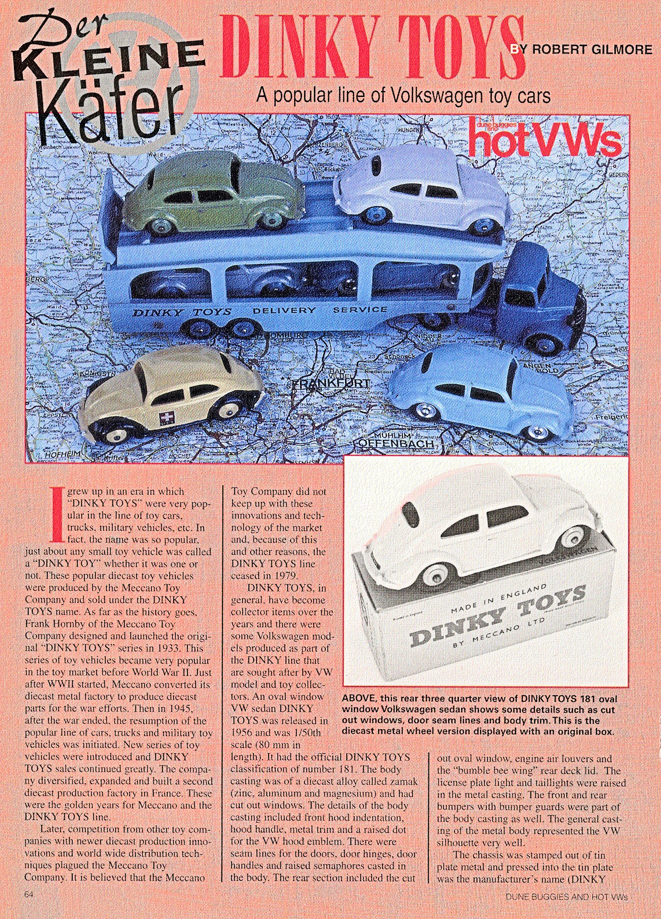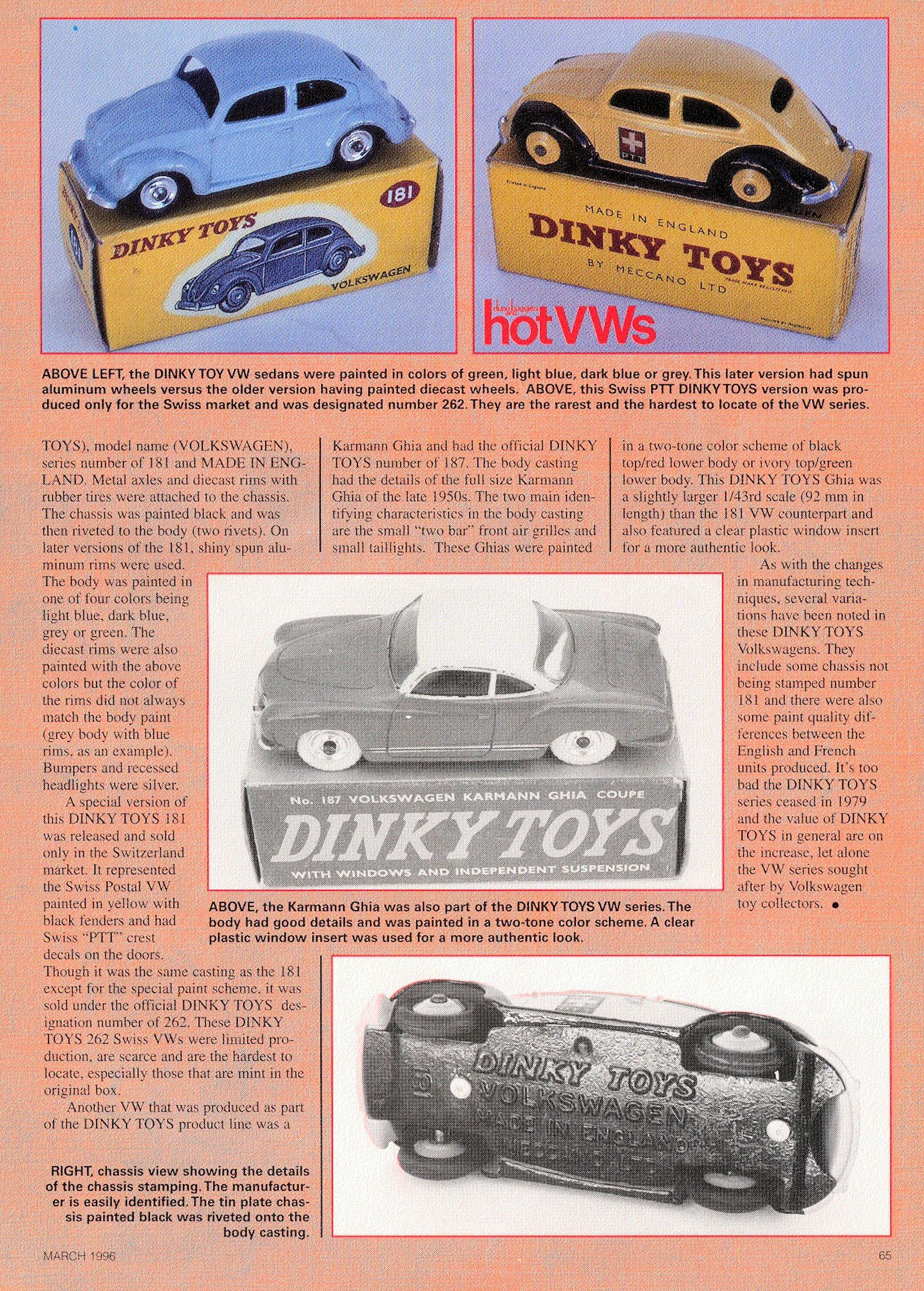 These popular diecast Volkswagen toy sedans were produced by the MECCANO TOY COMPANY and sold under the DINKY TOYS name.