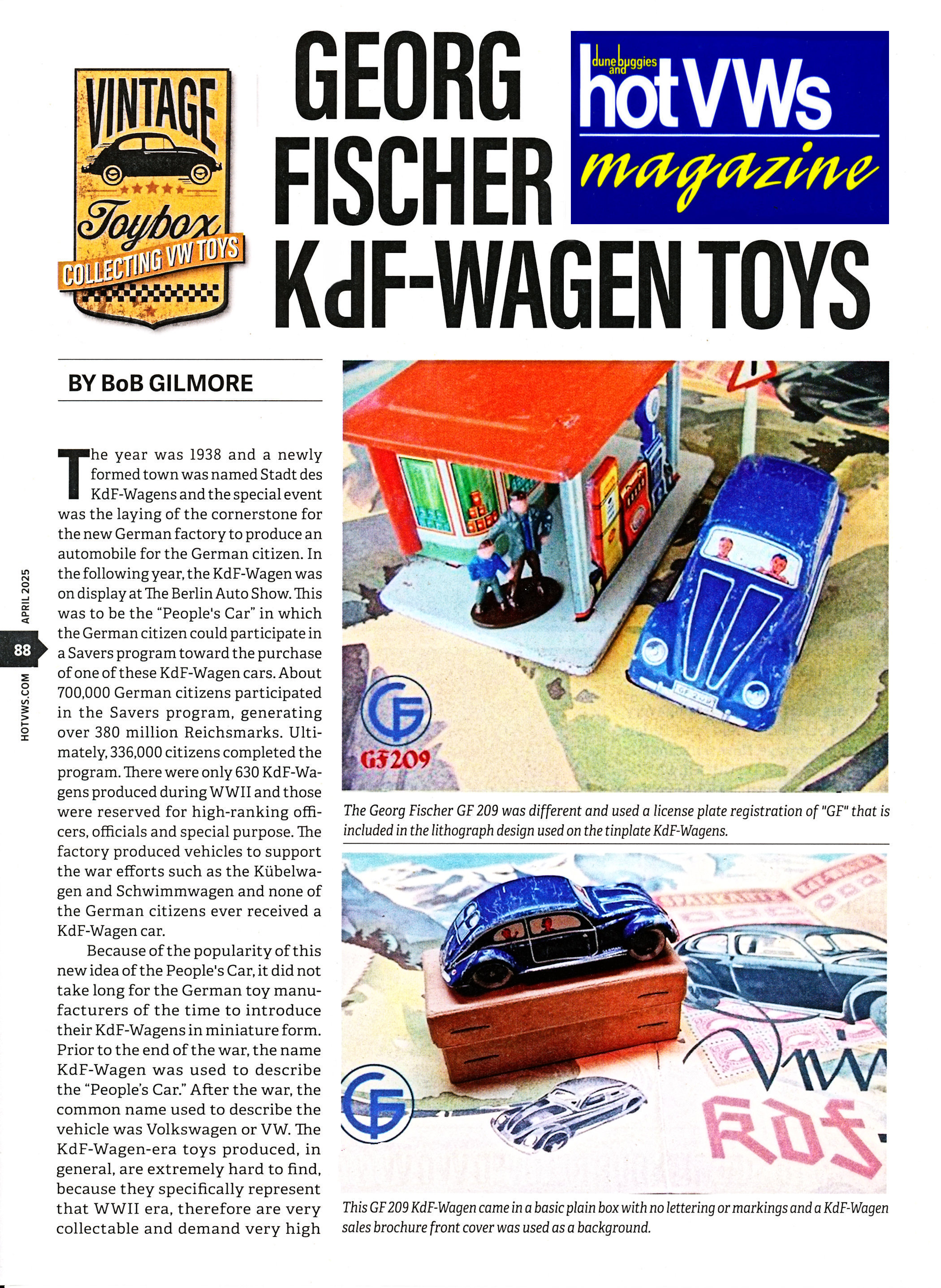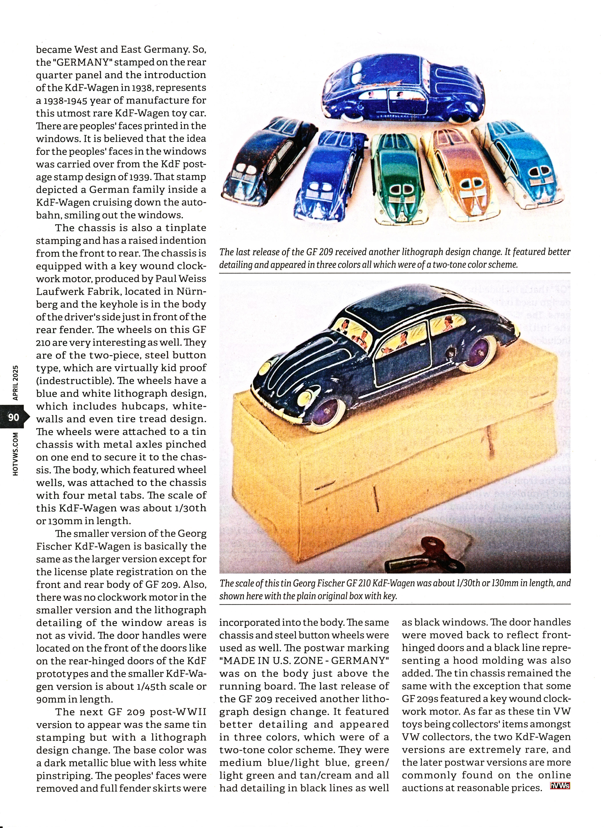 In the past, it has been a common practice for the toy manufactures to produce their toys and not place any identifying marks on their products. These marks would be the manufacture's name, insignia or any other identifying characteristics. Georg Fischer was different and used a license plate registration of "GF" that is included in the lithograph design used on the tin plate KdF Wagens.