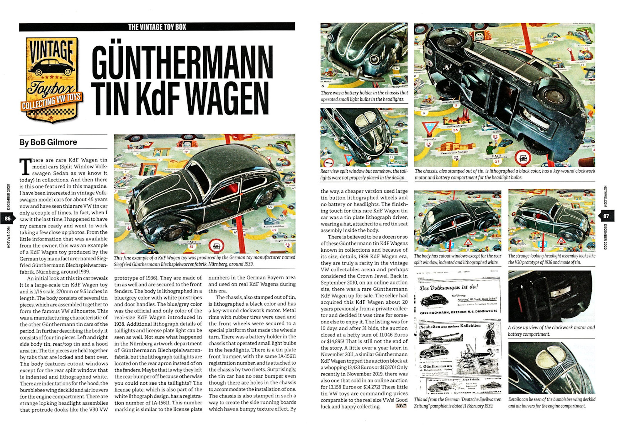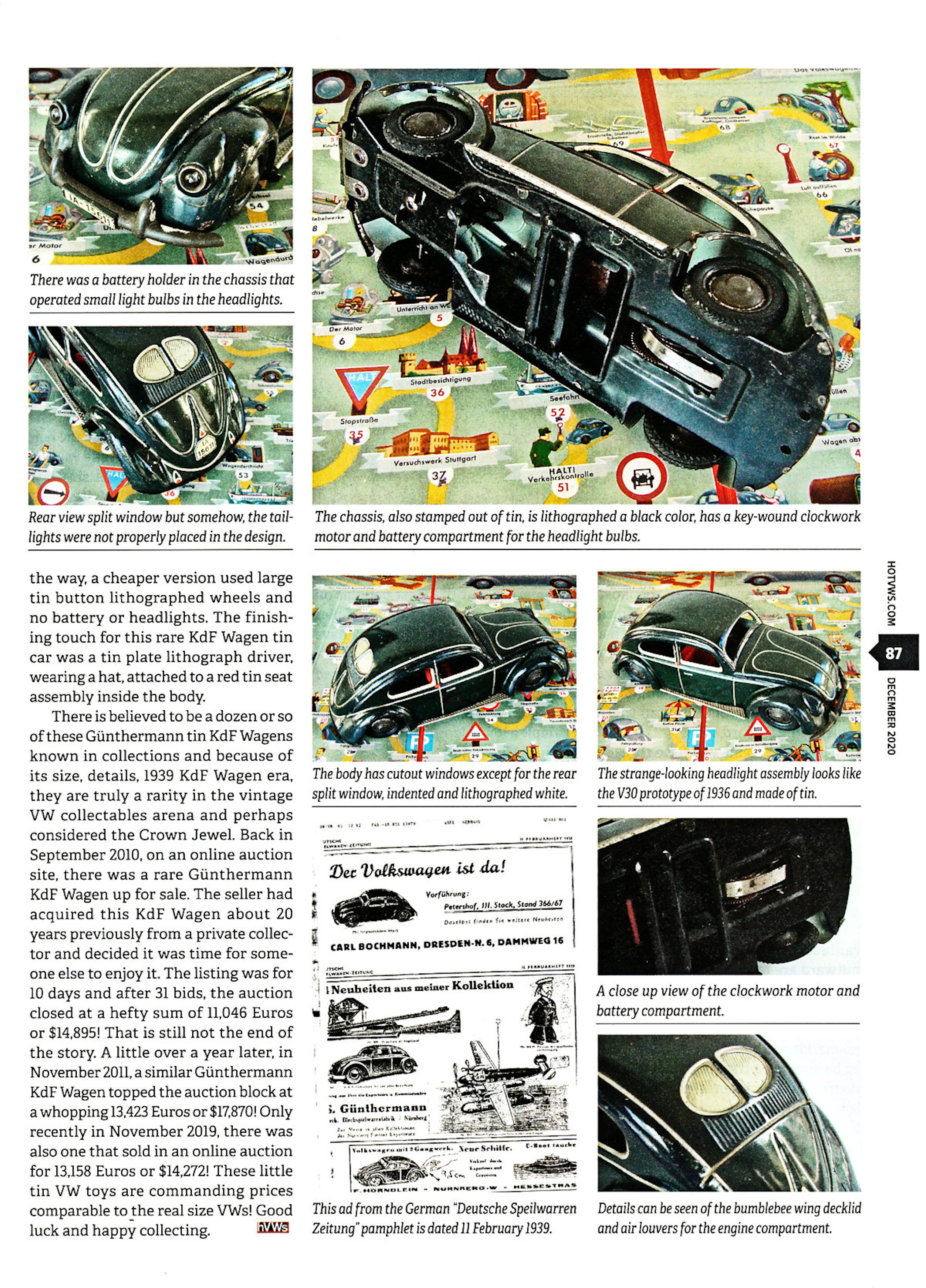 An initial look at this tin car reveals it is a large scale tin KdF Wagen toy and is 1/15 scale, 270mm or 9.5” in length. The body consists of several tin pieces, which are assembled together to form the famous VW silhouette. This was a manufacturing characteristic of the other Günthermann tin cars of the period.