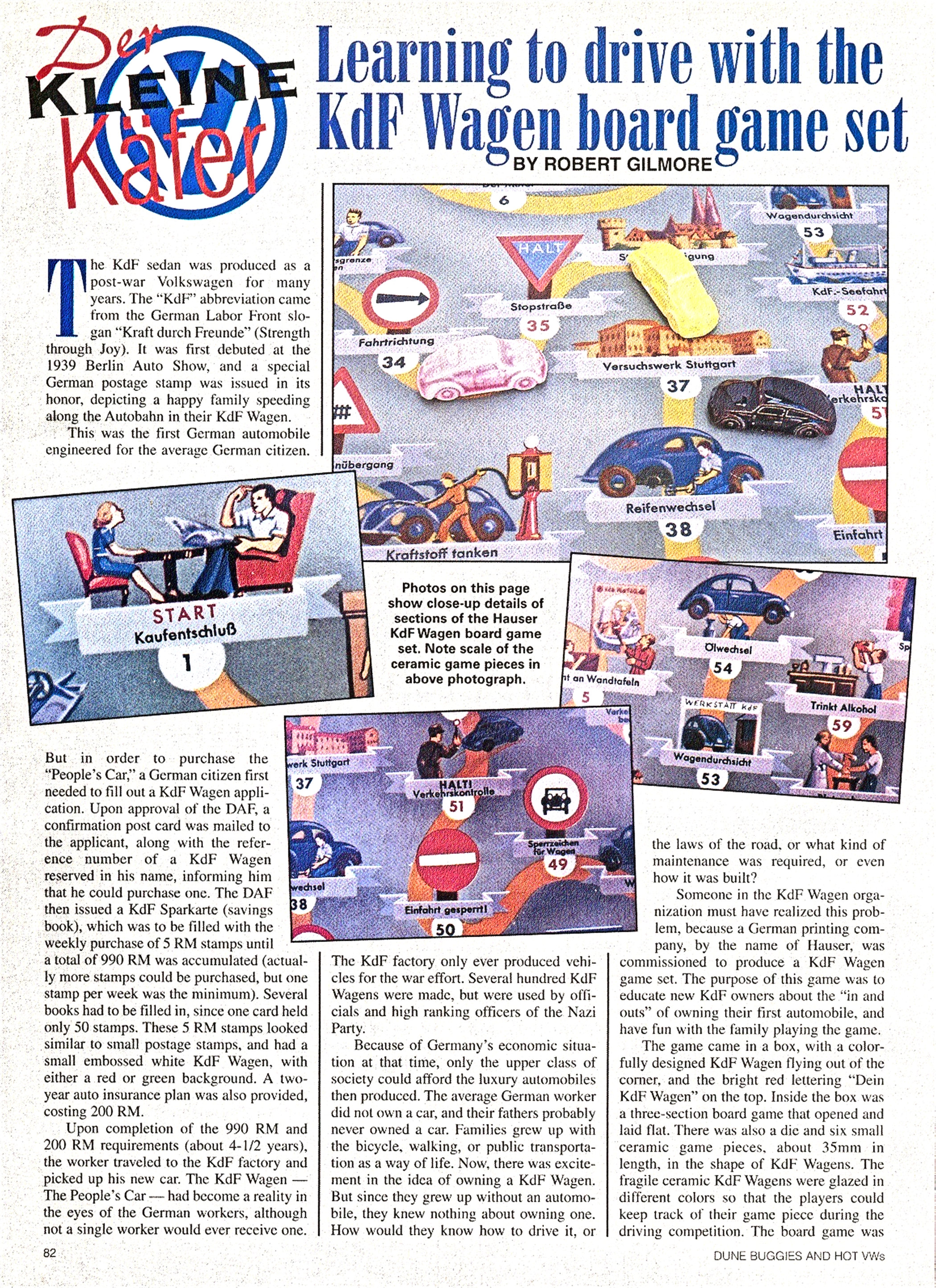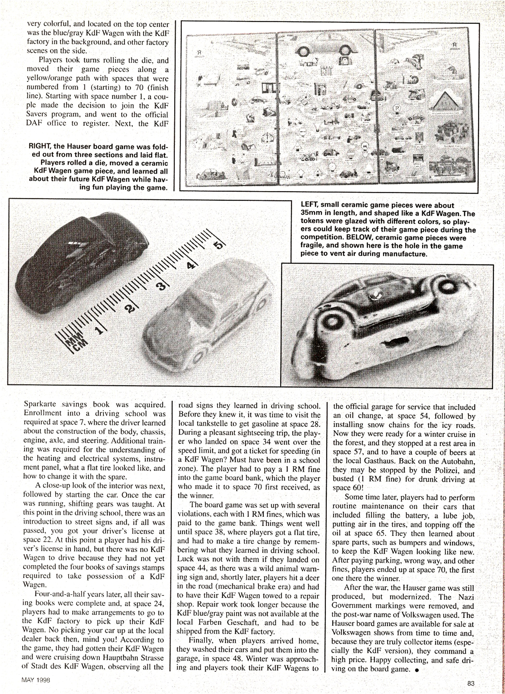 One piece solid ceramic VWs with wheels and very little body detailing. Used as game pieces (6) in the board game DEIN KdF WAGEN. The box art showed a blue gray KdF rising over a hill behind a tree.