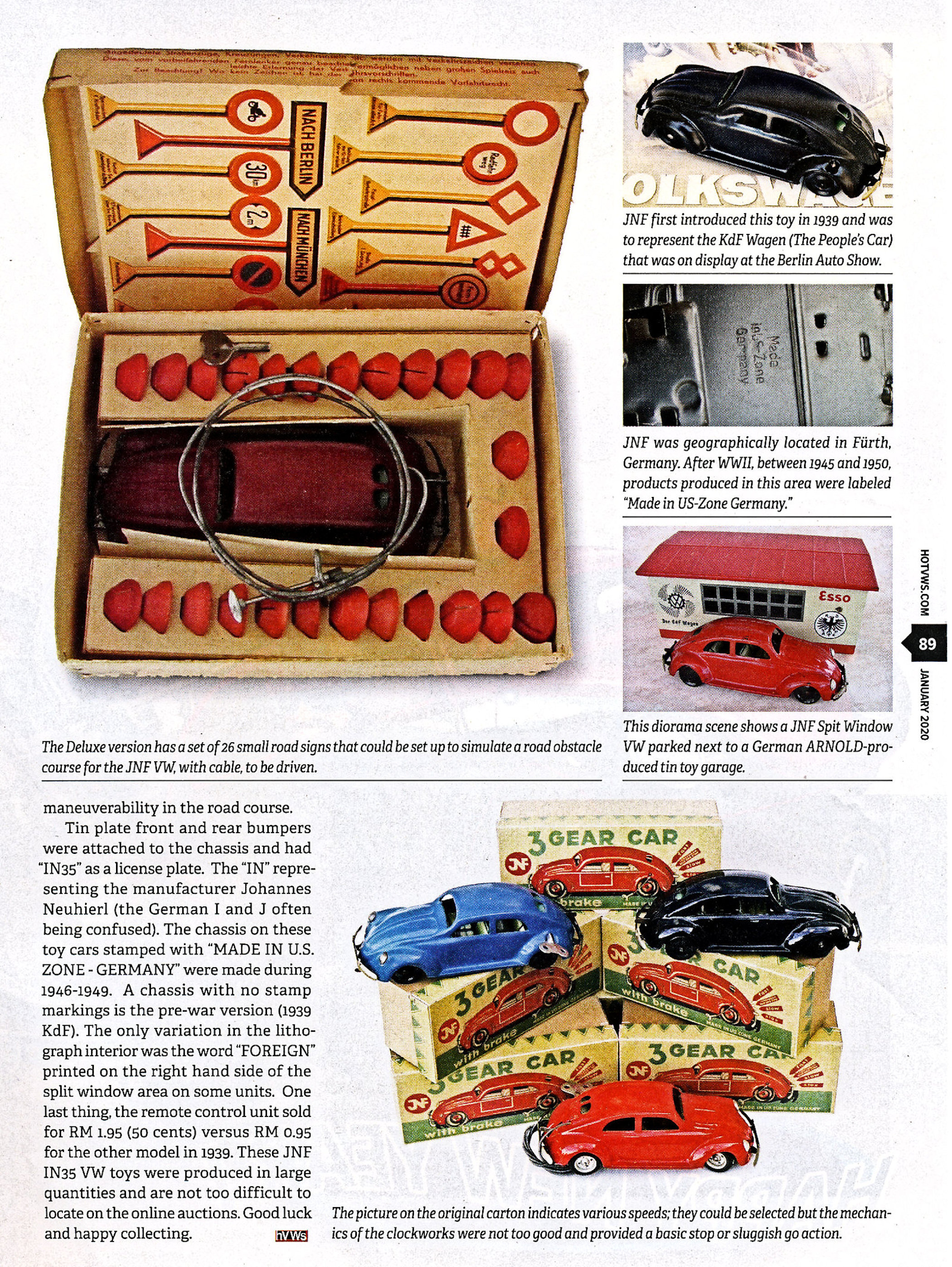 The VW toy in this magazine issue has no manufacturer markings but the printing on the original box or shipping carton reveals an identifiable insignia. The "JNF" insignia represents the German toy firm of Johnannes Neuhierl (JNF) founded in 1920 located in Fürth, Germany. The company name, JNF, is formed out of the first letters of his name and the town of Fürth.