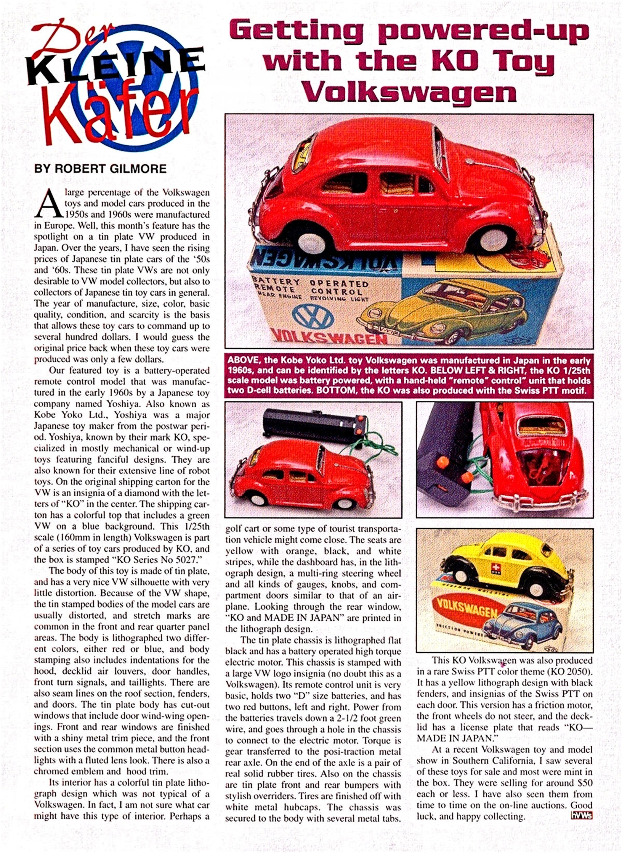 On the original shipping carton for the VW is an insignia of a diamond with the letters of "KO" in the center. The shipping carton has a colorful top that includes a green VW on a blue background. This 1/25th scale (160 mm in length) Volkswagen in part of a series of toy cars produced by KO and the box is stamped "KO Series No 5027."