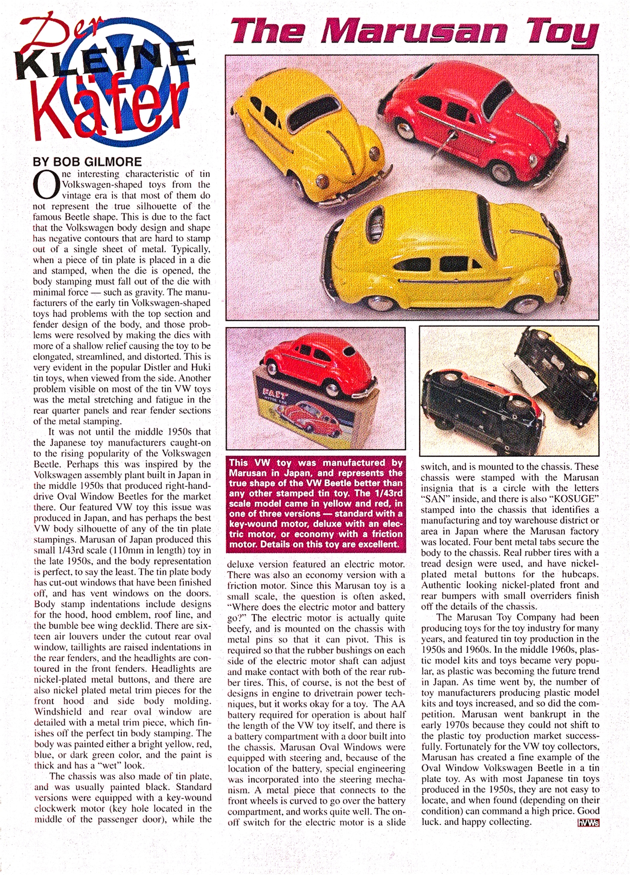 The VW toy in this issue was produced in Japan and has perhaps the best VW body silhouette of any of the tin plate stampings. MARUSAN of Japan produced this small 1/43rd scale (110mm in length) Volkswagen toy in the late 1950s and the body representation is perfect to say the least.