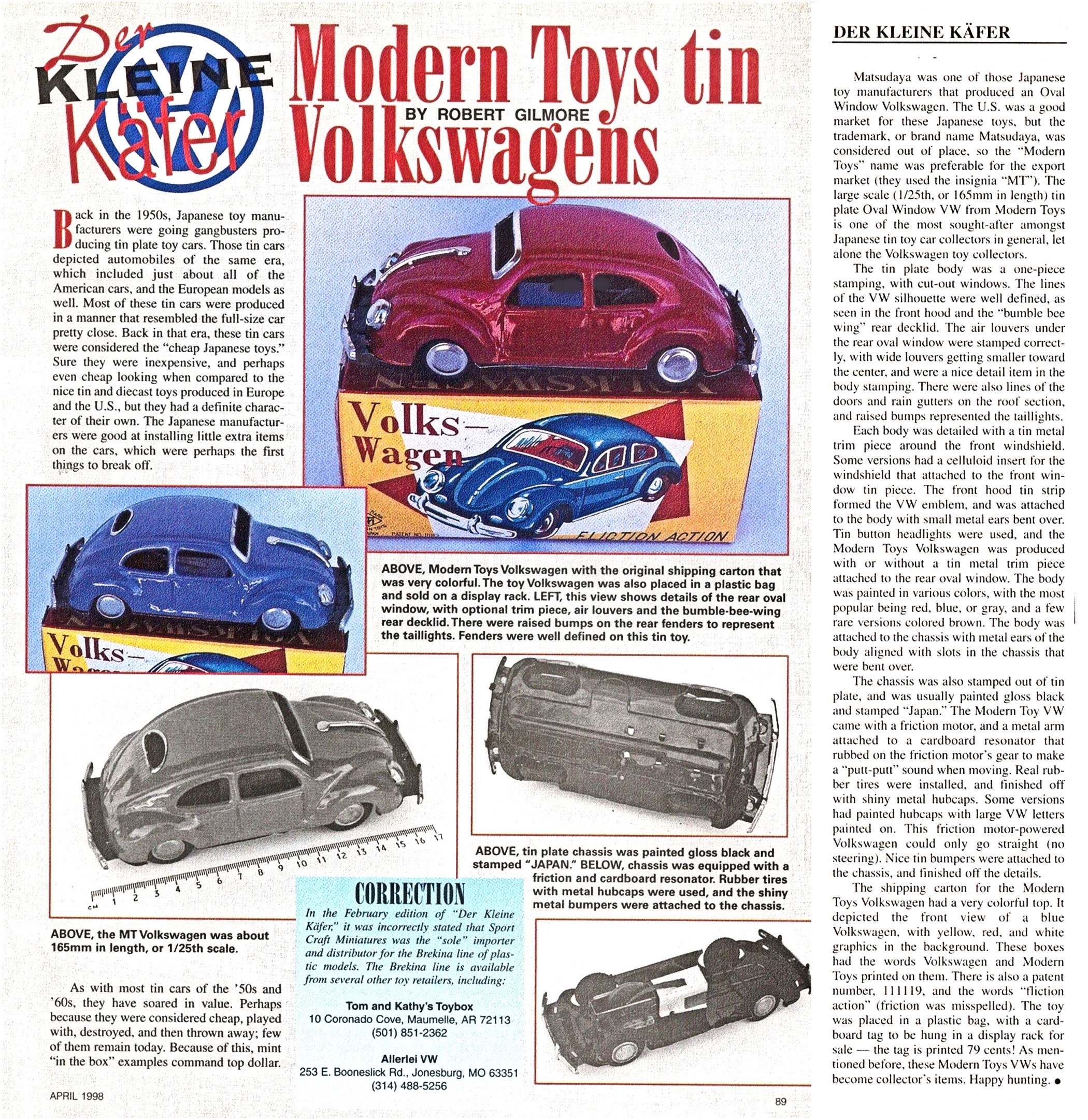 The MODERN TOYS VW has a tin body with cut out windows and very good details of the front hood, rear hood, door seams, taillights and rear oval window with 14 air louvers. Shiny tin metal headlights, front hood strip, windshield, front and rear bumpers. Rear oval window found with or without tin strip.