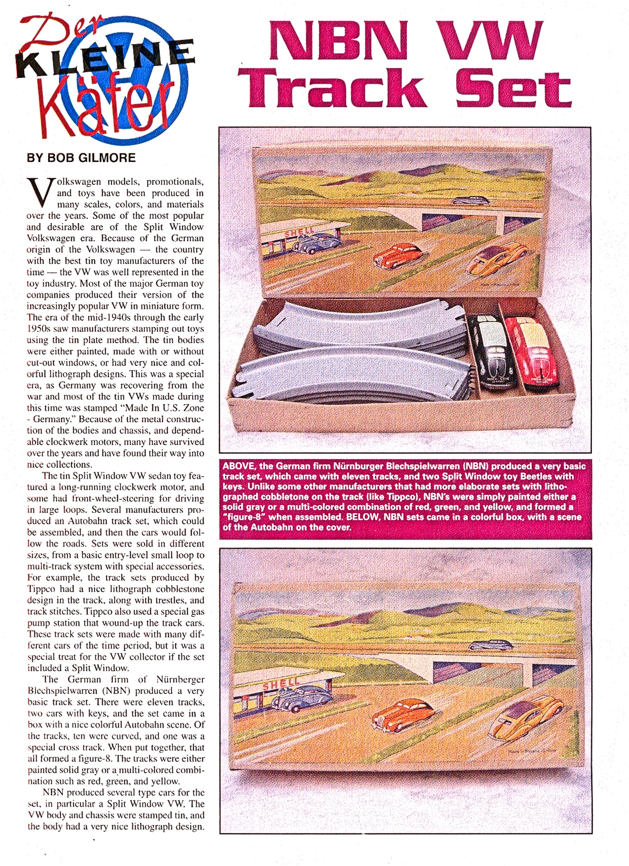 The tin Split Window VW Sedan toys were produced as a single toy to play with which featured a long running clockwerk motor and some had front wheel steering for driving in large loops. Several manufacturers produced an autobahn track set which could be set up and those track cars would follow the roads of the track set.