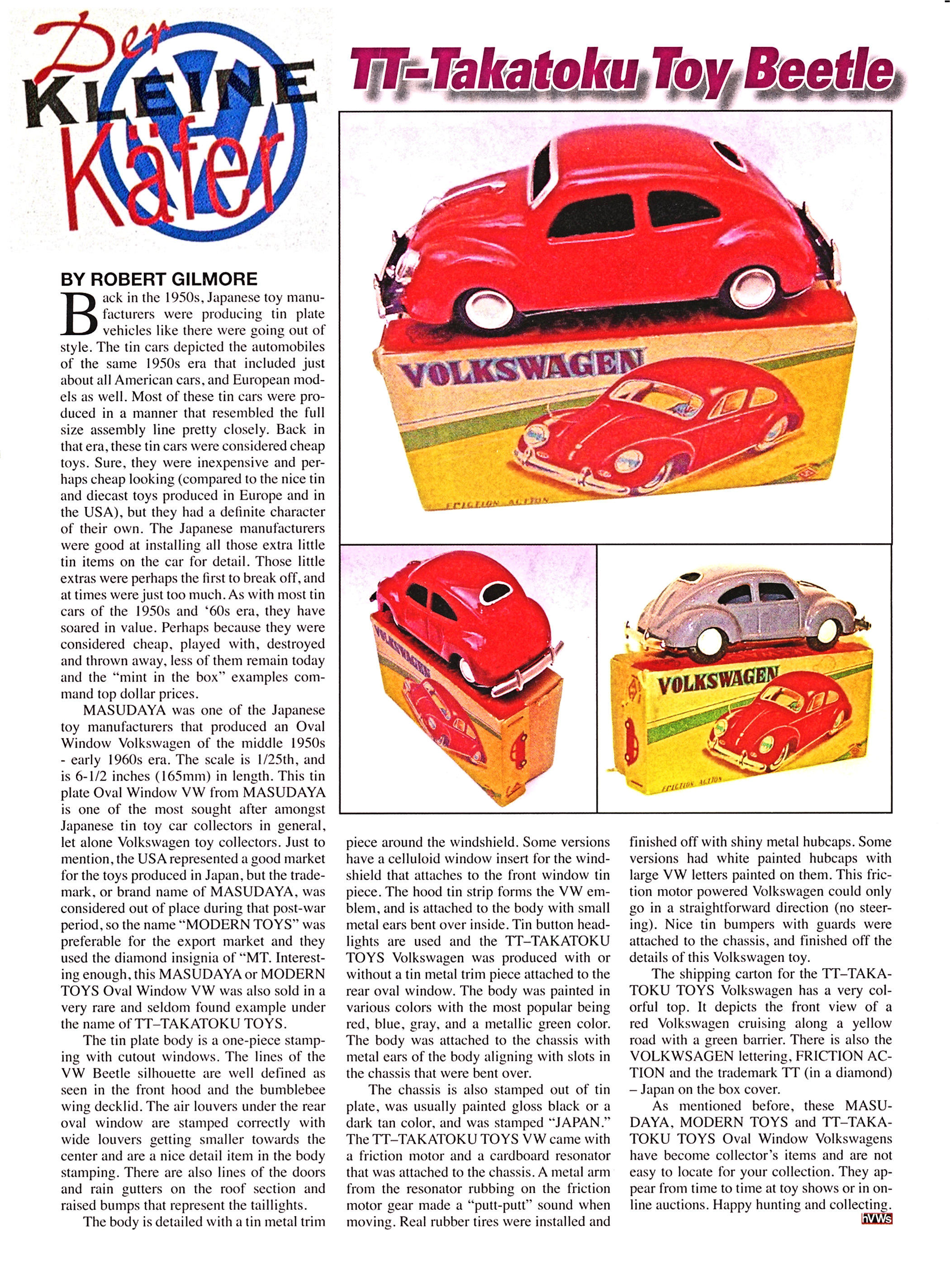 This tin VW is the same as the MODERN TOYS - MASUDAYA Oval VW. For some unknown reason, this MASUDAYA Oval Window VW is sold in a box with the Japanese manufacturer TAKATOKY TOYS (T.T. TOYS) insignia printed on the box cover.