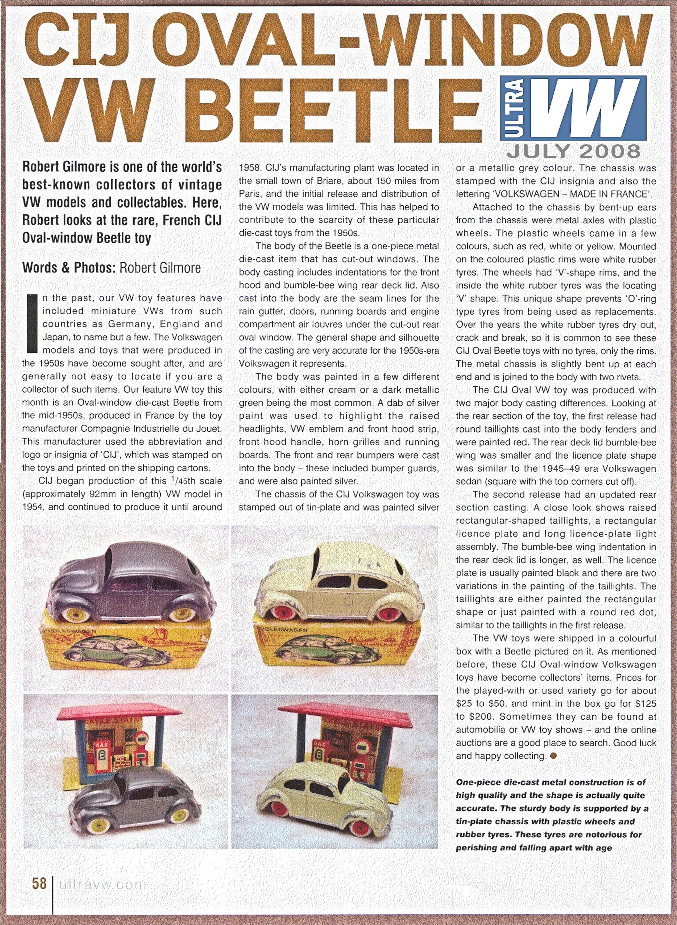 Our feature VW toy this issue is an oval window diecast from the middle 1950's produced in France by the toy manufacturer of COMPAGNIE INDUSTRIELLE du JOUET and used the logo or insignia of "CIJ.”