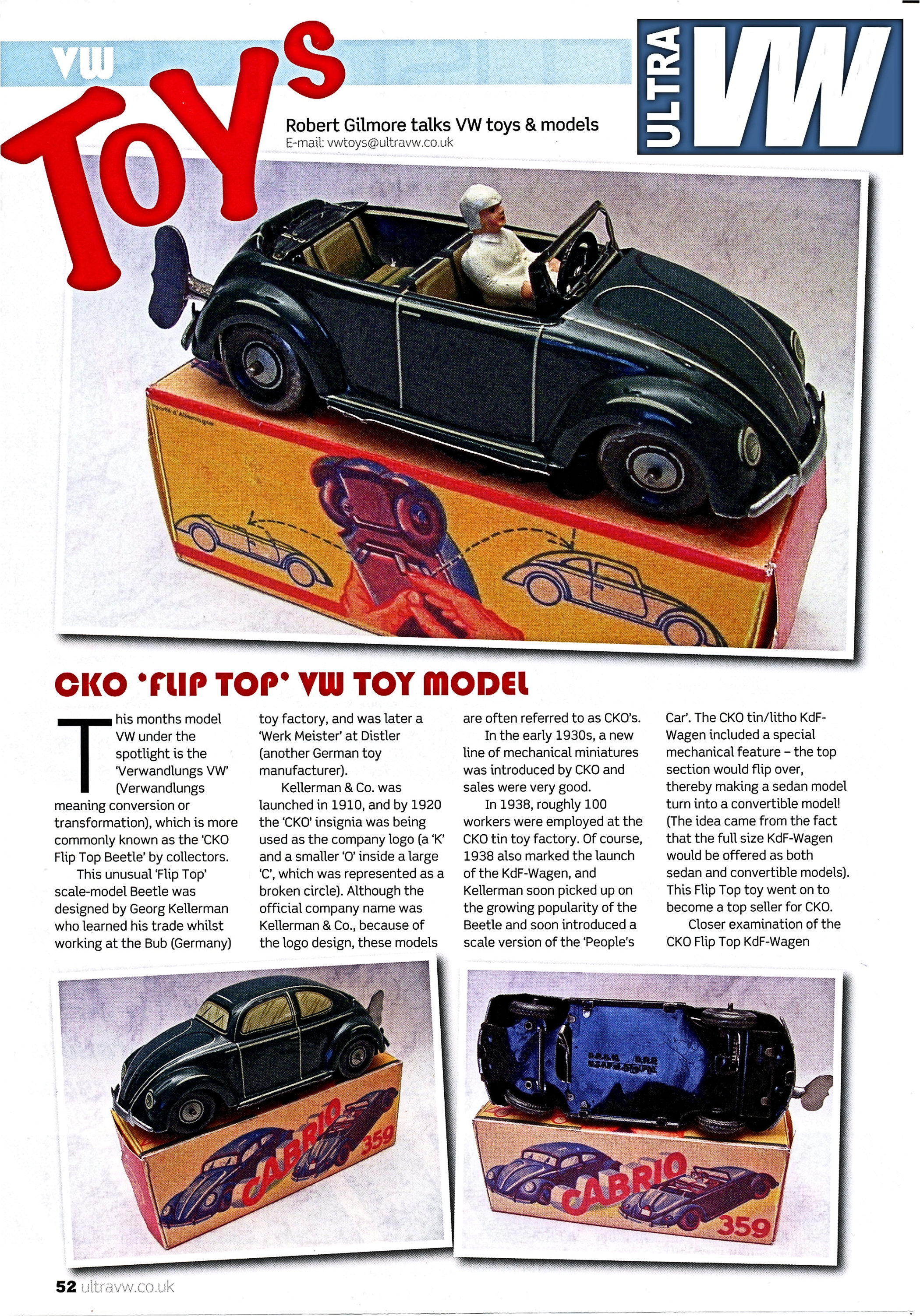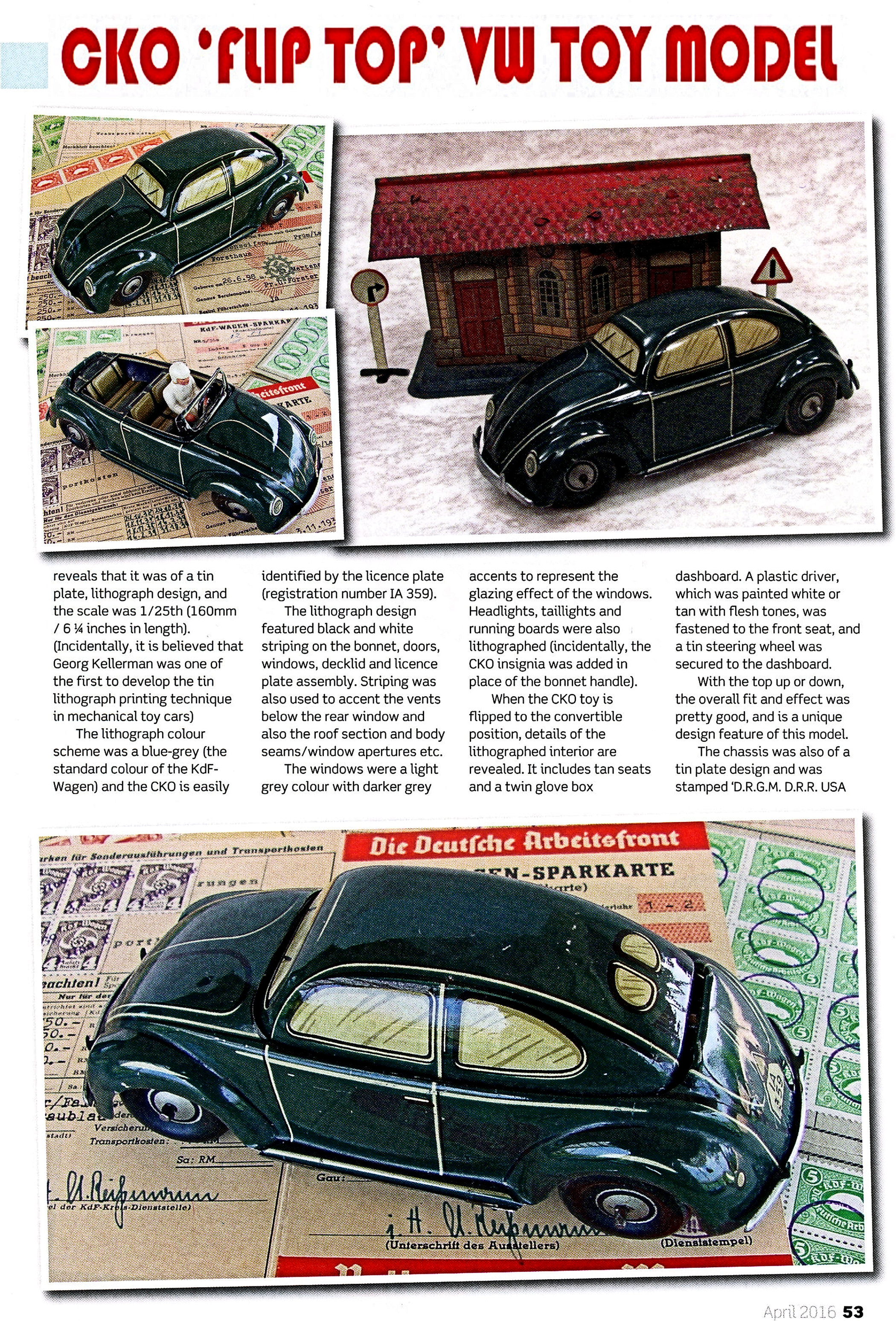 Three-piece lithographed tinplate body with solid windows that very nicely depicts the KdF Wagen of the time. Usually found with slightly different shades of the KdF blue/grey color. A lever under the base plate rotates the top to transfer the Sedan model into an open Cabriolet with lithographed tinplate seats, dashboard, steering wheel and separate driver (white or brown).