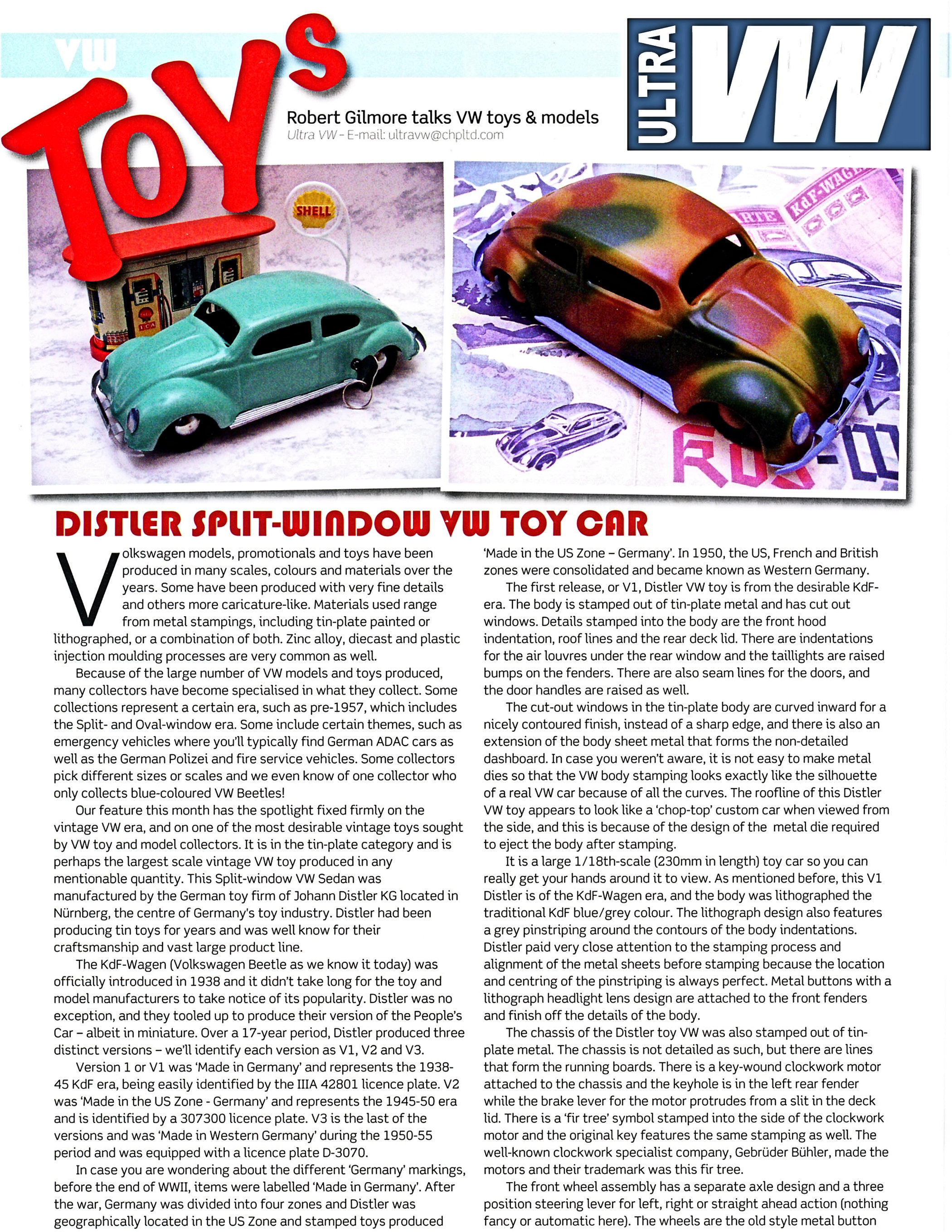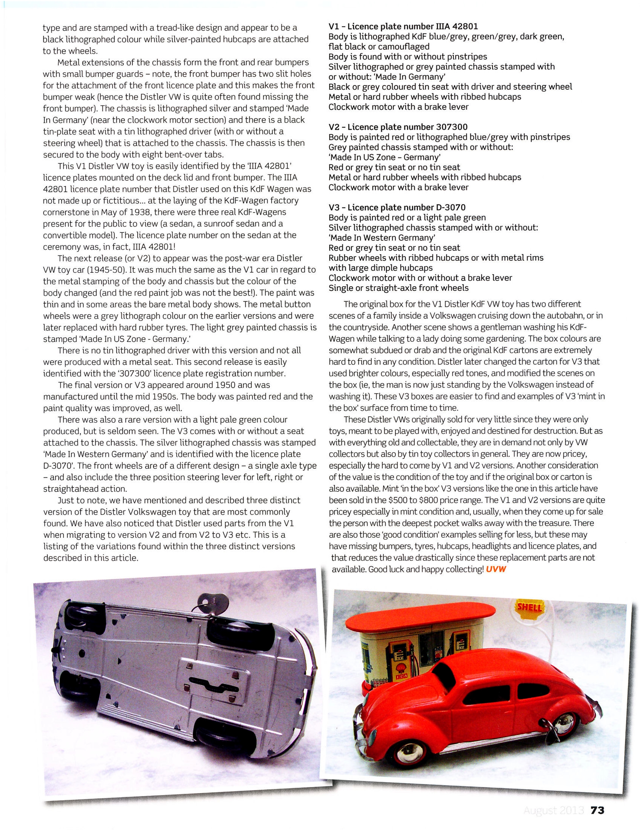 A very nicely painted, red, blue or green, tinplate body with cut out windows and tin lithographed button headlights. Tin plate chassis, usually painted silver or grey, with bumpers, rubber wheels and key wound clockwork motor with or without a brake lever protruding out of the rear hood.