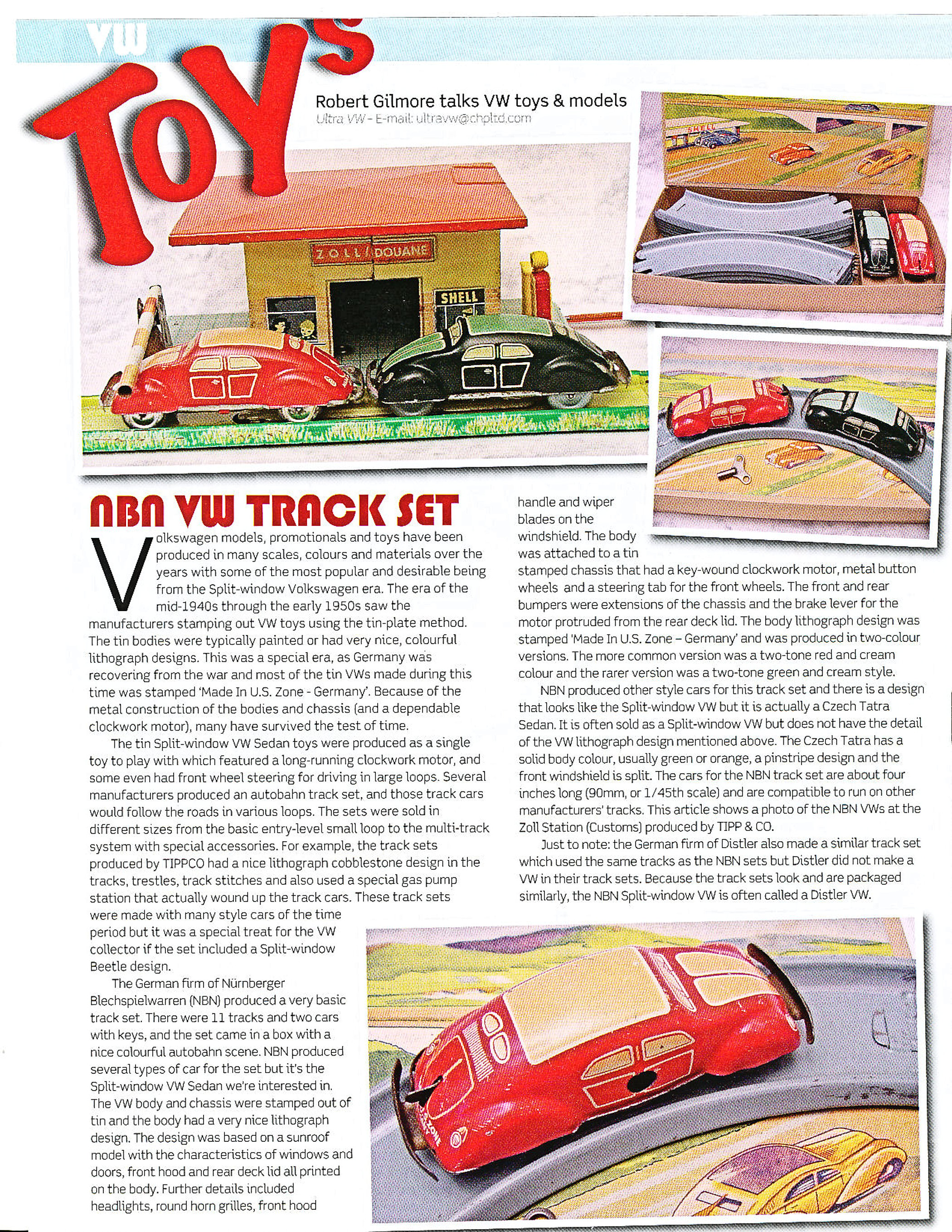 Nürnberger Blechspielwarenfabrik (NBN) produced this Volkswagen toy in a two-tone red or green tin plate lithographed body with white striping for the windows, doors, front hood, headlights, taillights, split window and louvers.