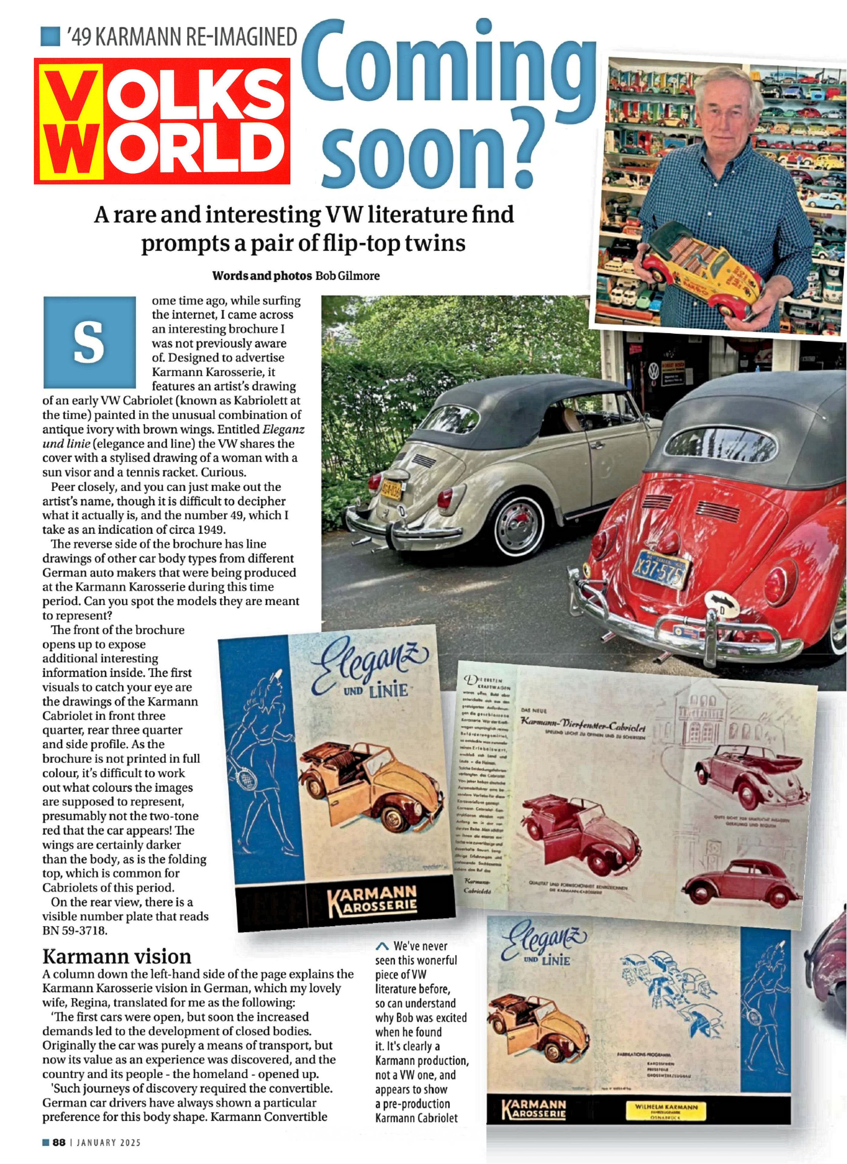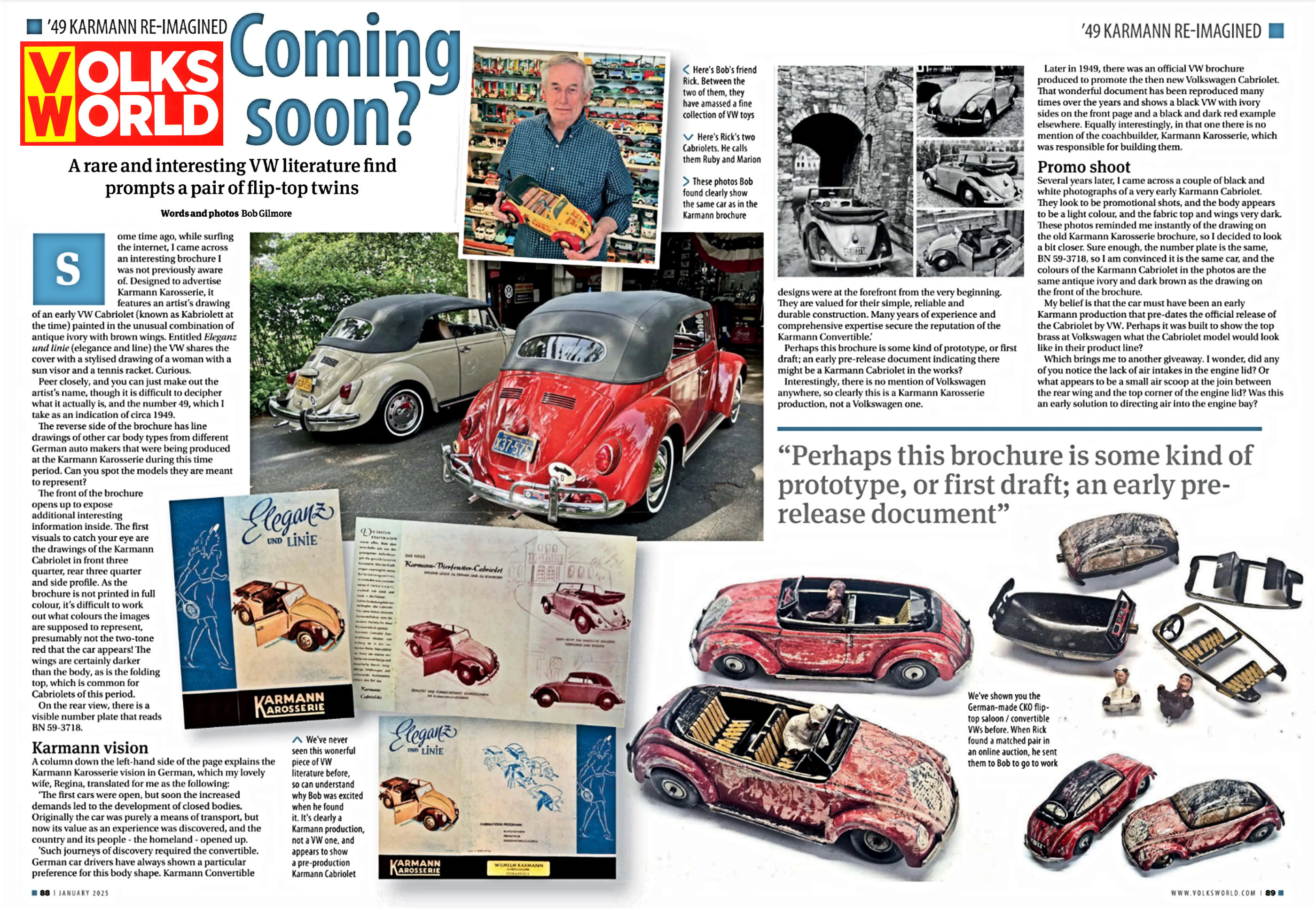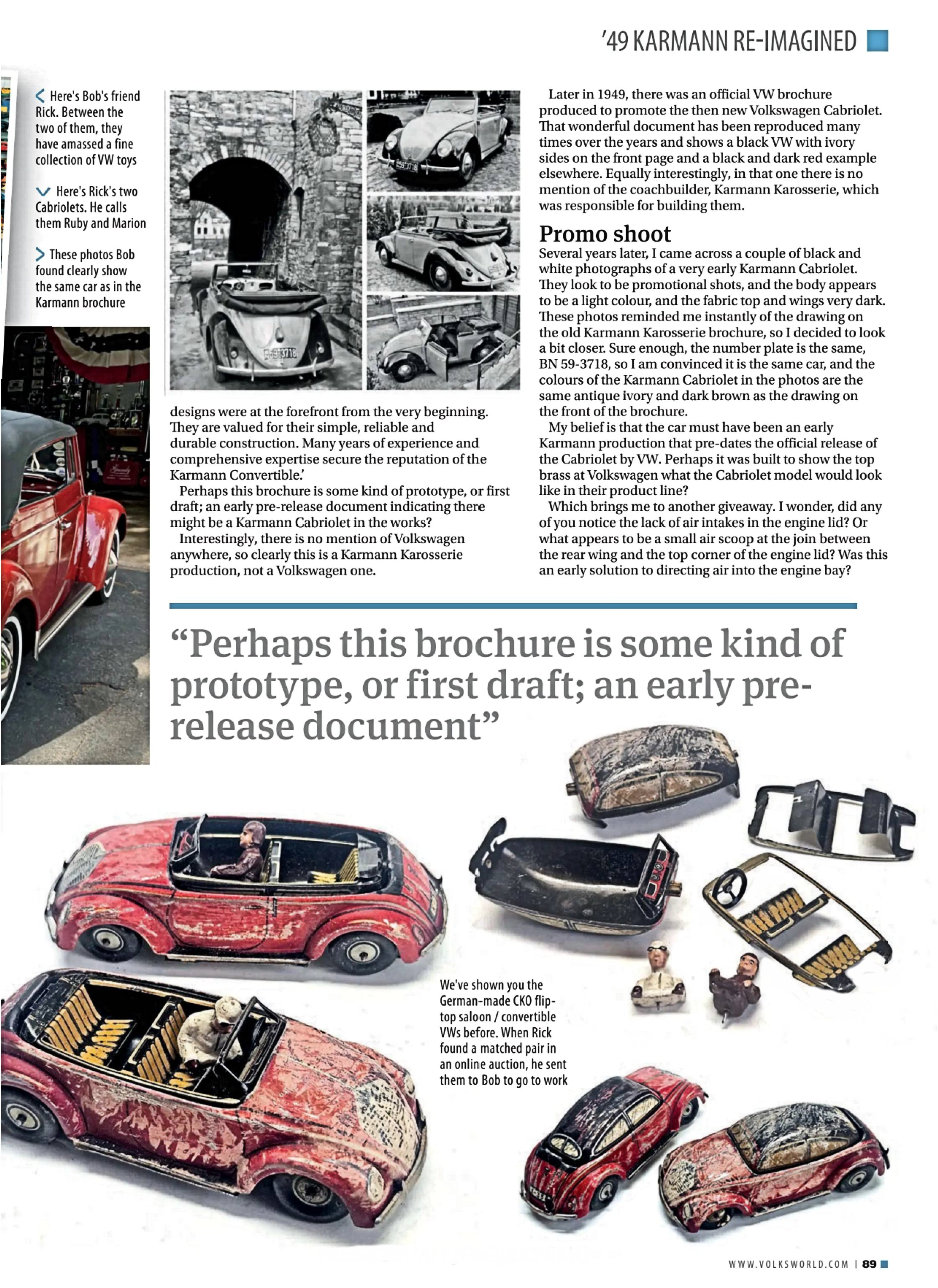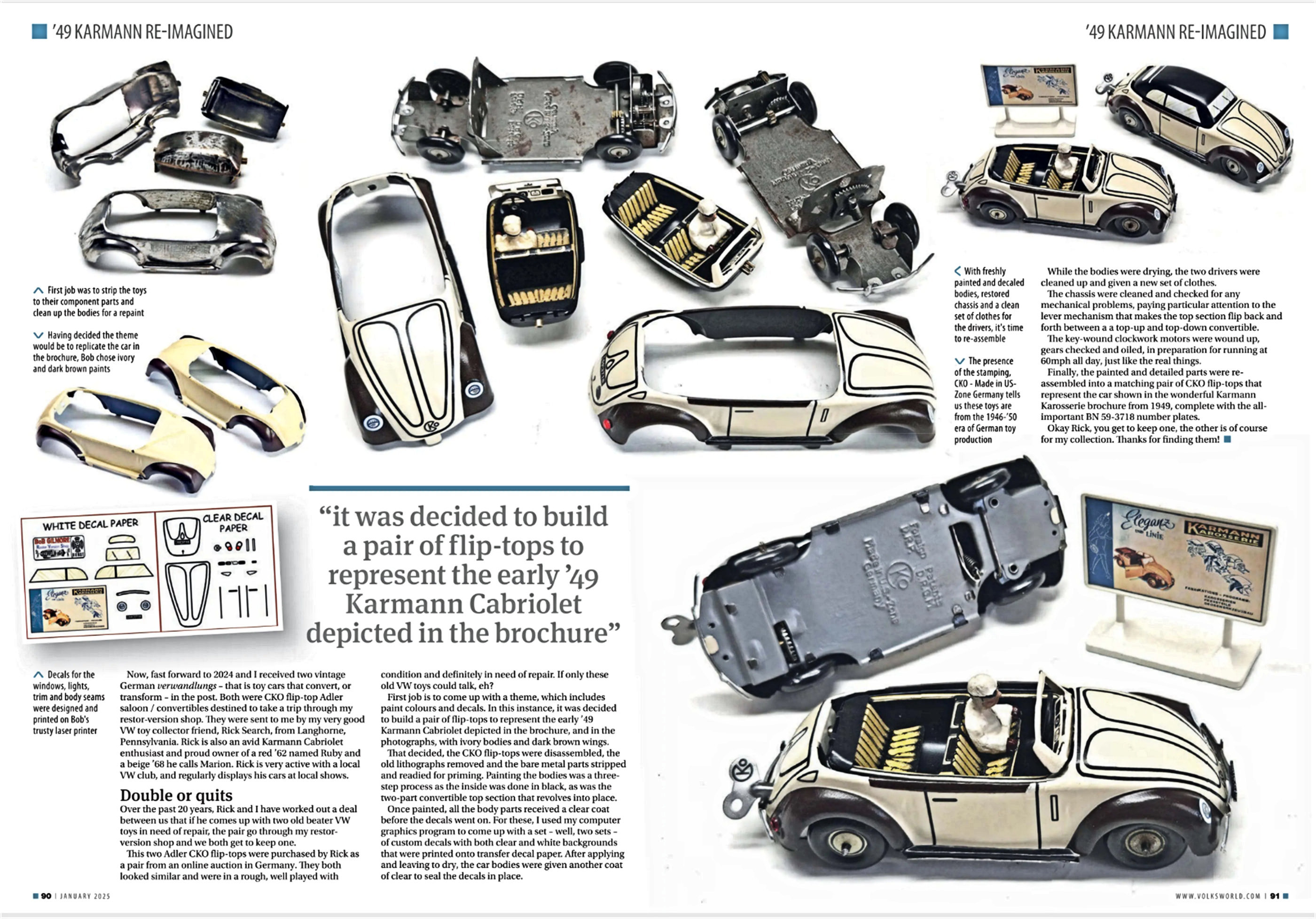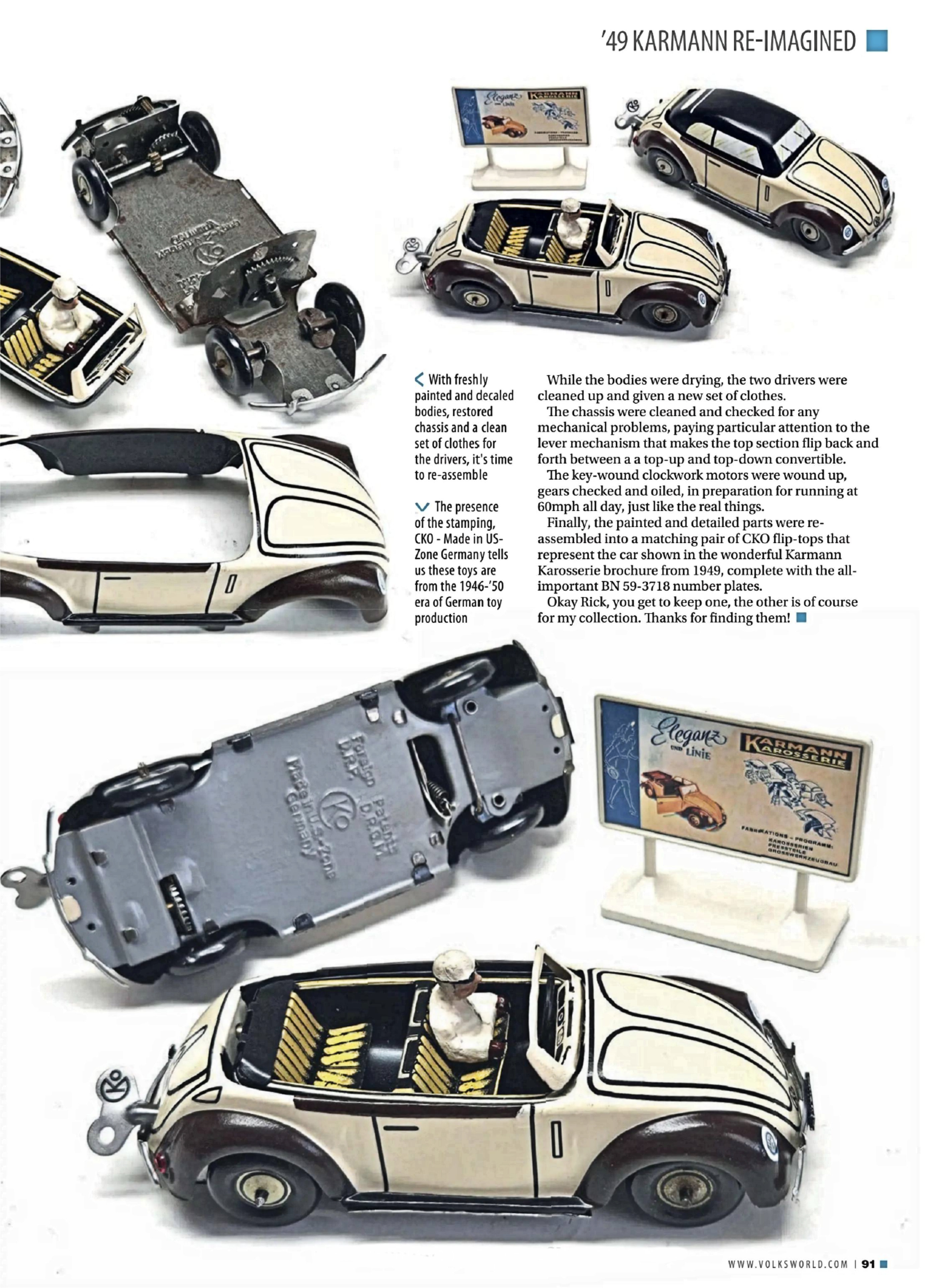The article has a great story line along with the conversion of the two vintage CKO flip top VW toys to match the Karmann prototype.