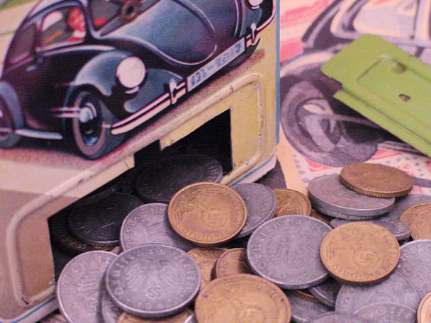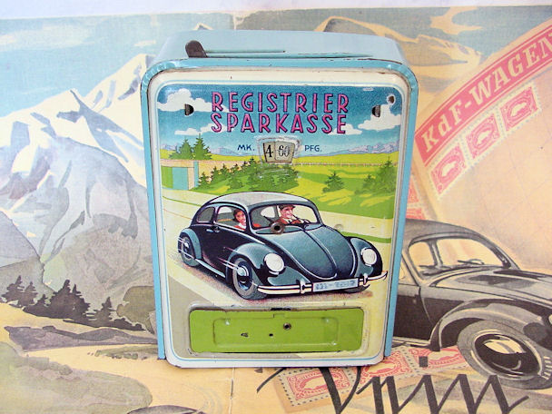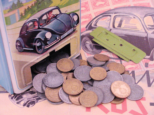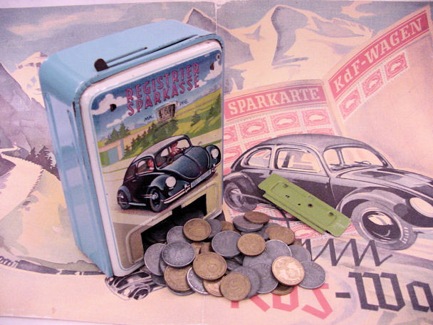 This GEOBRA KdF Savers Bank was bought in 2006 from a private estate sale in Potsdam, Germany (former East German town near Berlin). The bank (spardose or sparkasse) was heavy with coins when purchased and a spring hook was used to pick the lock on the front door to open the bank. Amazingly and to what a huge surprise as the bank was full of old German coins with the dates ranging from 1937 to 1943. All the zinc and brass coins were in nice condition after being hidden away all those years and they had the German wartime eagle with swastika on them. Time had really stood still for this awesome discovery. There were a total of 64 coins that added up exactly to the 4 Reichsmarks and 60 Reichspfennig inside the bank as indicated on the MK-PFG window on the Bank. WOW !! Truly an awesome piece of history here especially the newest coins being dated 1943 and who knows what may have happened to the original owner of the bank or reason to stop saving for that KdF Wagen?