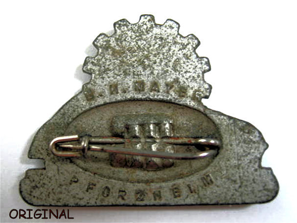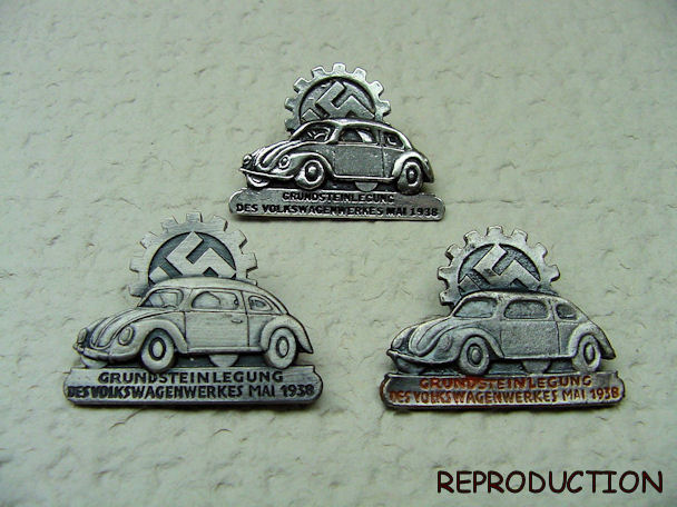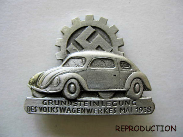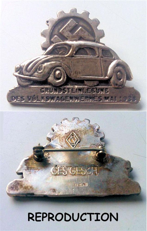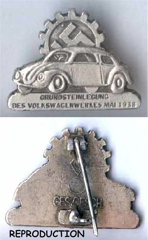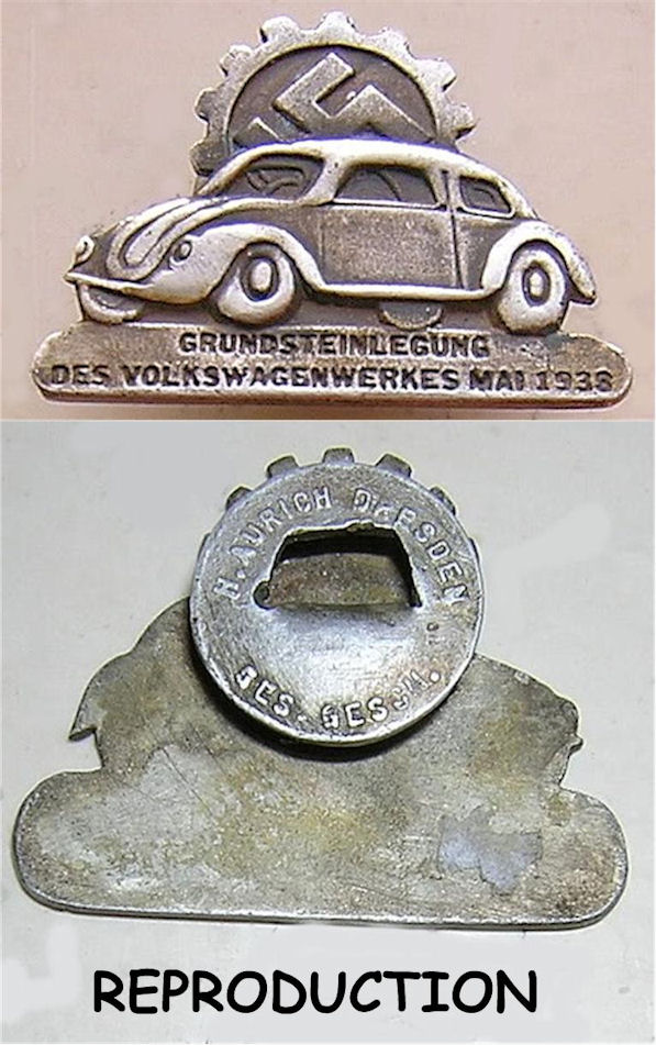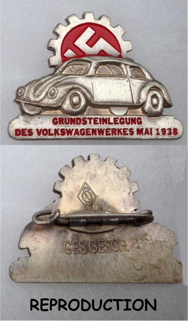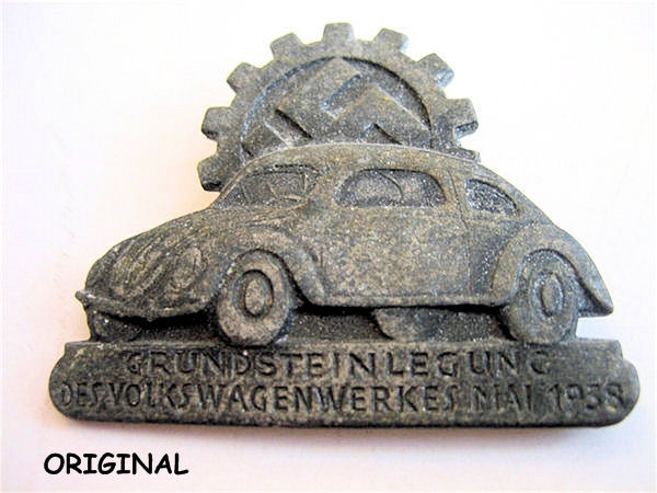 A suitable location for the production factory was decided upon in northern Germany, on a twenty square mile parcel of land near the 14th century Wolfsburg Castle. The GRUNDSTEINLEGUNG des VOLKSWAGENWERKES or Cornerstone Ceremony for the location of the new factory was held in the newly formed town of Stadt des KdF Wagens on May 26, 1938, with Der Führer and Dr. Porsche in attendance. Three of the VW TYPE 38 KdF vehicles (a dark blue Sedan, a black Sunroof Sedan and a dark burgundy Convertible) were in attendance as well, for the people to view. The KdF Sedan model was a split-window Beetle in which its basic design would be produced as a post war Volkswagen for decades to come. The KdF abbreviation came from the German Labor Front slogan "Kraft durch Freude" (Strength through Joy). It was estimated that seventy thousand people also attended the Cornerstone Ceremony and because of the isolated area in Germany at the time, most traveled by 28 special trains to attend or in one of the hundreds of autos present. There were also 600 guests of honors and 150 reporters as well. At the Cornerstone Ceremony, a special badge was given out to the attendees and perhaps over 10,000 badges were believed to have been made for the event. The small badges, width 40mm, height 31mm and thickness of 1,65mm, had a KdF Wagen in the center, a Swastika inside a cogwheel on the top background and the lettering of GRUNDSTEINLEGUNG des VOLKSWAGENWERKES MAI 1938 in a banner on the bottom. These badges were made of a very lightweight Bakelite material, about 3 grams, with a thin layer of silver paint on the surface. The paint easily wore off on the edges or high relief surface areas of the badge over the years from handling or moving around in a jewelry box. There was a special looking clasp pin machine pressed into the back of the Bakelite badge to secure it to a coat or jacket. The manufacturer was B.H. MAYER (Bernhard Heinrich) of Pforzheim, Germany, who by the way made the first workers badges for the KdF Wagen factory. The key identification of an authentic Cornerstone Ceremony pin is that there is B.H. MAYER – Pforzheim lettering or no lettering at all on the back of the original badge. Since the badge was a giveaway, little cost was involved in making them in quantity for the event and you could actually call them an inexpensive giveaway trinket. These original badges are over eighty years old now and have become a collector’s item with not too many surviving over the years and can be pricey depending on the condition.