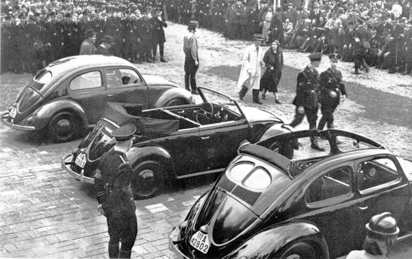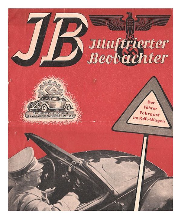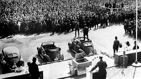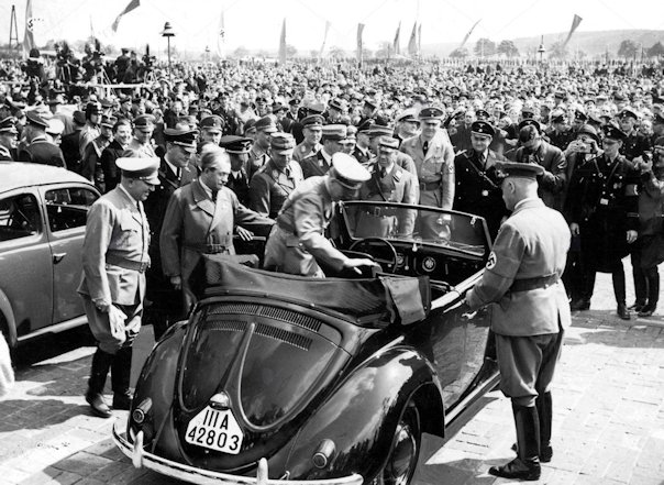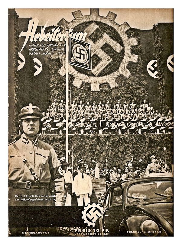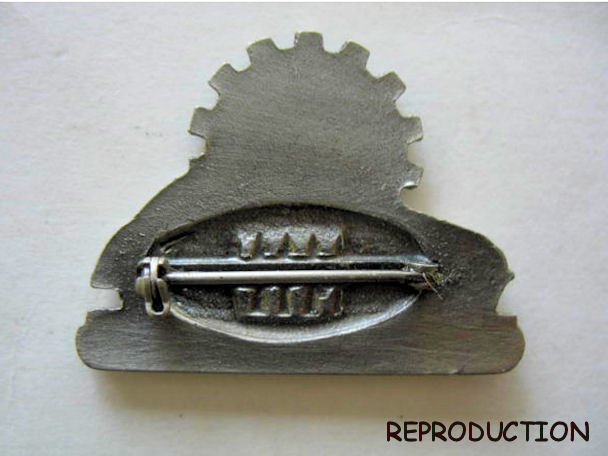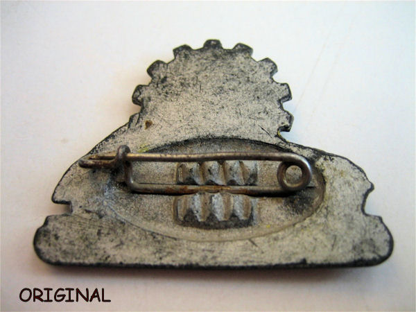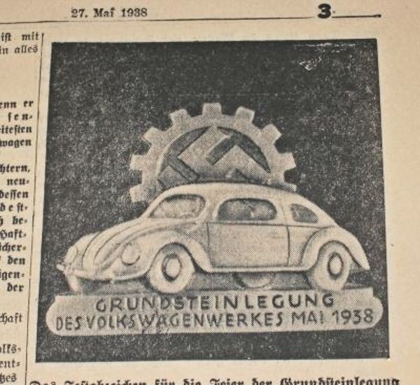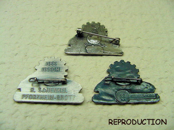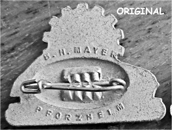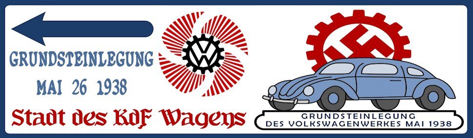 A suitable location for the production factory was decided upon in northern Germany, on a twenty square mile parcel of land near the 14th century Wolfsburg Castle. The GRUNDSTEINLEGUNG des VOLKSWAGENWERKES or Cornerstone Ceremony for the location of the new factory was held in the newly formed town of Stadt des KdF Wagens on May 26, 1938, with Der Führer and Dr. Porsche in attendance. Three of the VW TYPE 38 KdF vehicles (a dark blue Sedan, a black Sunroof Sedan and a dark burgundy Convertible) were in attendance as well, for the people to view. The KdF Sedan model was a split-window Beetle in which its basic design would be produced as a post war Volkswagen for decades to come. The KdF abbreviation came from the German Labor Front slogan "Kraft durch Freude" (Strength through Joy). It was estimated that seventy thousand people also attended the Cornerstone Ceremony and because of the isolated area in Germany at the time, most traveled by 28 special trains to attend or in one of the hundreds of autos present. There were also 600 guests of honors and 150 reporters as well. At the Cornerstone Ceremony, a special badge was given out to the attendees and perhaps over 10,000 badges were believed to have been made for the event. The small badges, width 40mm, height 31mm and thickness of 1,65mm, had a KdF Wagen in the center, a Swastika inside a cogwheel on the top background and the lettering of GRUNDSTEINLEGUNG des VOLKSWAGENWERKES MAI 1938 in a banner on the bottom. These badges were made of a very lightweight Bakelite material, about 3 grams, with a thin layer of silver paint on the surface. The paint easily wore off on the edges or high relief surface areas of the badge over the years from handling or moving around in a jewelry box. There was a special looking clasp pin machine pressed into the back of the Bakelite badge to secure it to a coat or jacket. The manufacturer was B.H. MAYER (Bernhard Heinrich) of Pforzheim, Germany, who by the way made the first workers badges for the KdF Wagen factory. The key identification of an authentic Cornerstone Ceremony pin is that there is B.H. MAYER – Pforzheim lettering or no lettering at all on the back of the original badge. Since the badge was a giveaway, little cost was involved in making them in quantity for the event and you could actually call them an inexpensive giveaway trinket. These original badges are over eighty years old now and have become a collector’s item with not too many surviving over the years and can be pricey depending on the condition.