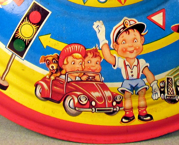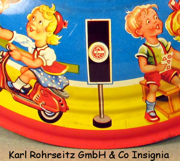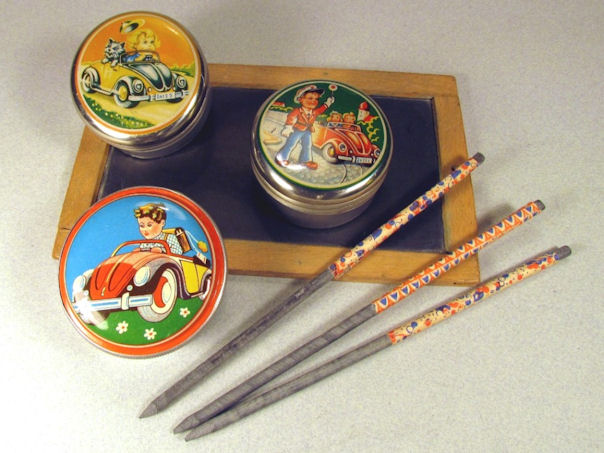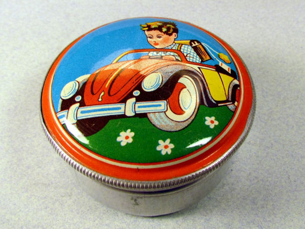 In the early WWII post war years, to conserve paper, German school children all had little blackboards and chalk-like markers to complete their math and handwriting assignments. The well-equipped student also had a cloth and a little aluminum tin with a screw on top that were called a schwammdose. Inside the schwammdose was a wet sponge to erase and clean the blackboard. These schwammdoses came with a variety of themes for boys and girls and had various lithograph designs with everything from clowns to cowboys on the lid. But, lucky for VW collectors, some of them came with a Vintage Volkswagen theme and kids enjoying their VW Beetle Cabrio's lithographed on the schwammdose lid. There are no markings on these three VW Cabrio schwammdoses. From comparing them to other spardoses of the same time period, especially the lithograph artwork, they were definitely produced in the late 1940s - early 1950s and the manufacturer was no doubt Karl Rohrseitz GmbH & Co located in Zirndorf, Germany.