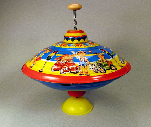 Karl Rohrseitz GmbH & Co produced a colorful spinning top that had graphics of a Cabrio VW with children and a dog inside. The top is marked "Made in Western Germany" - approximately 20cm in diameter and 20cm high.