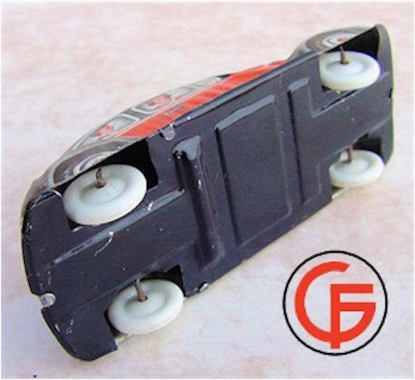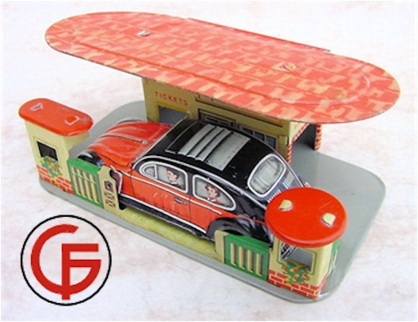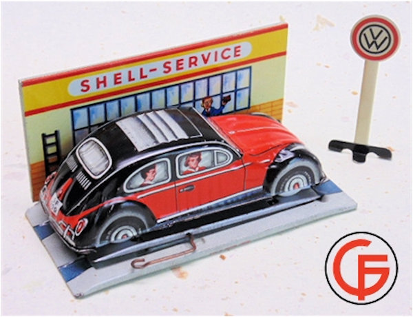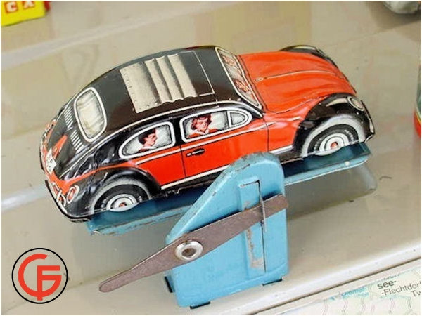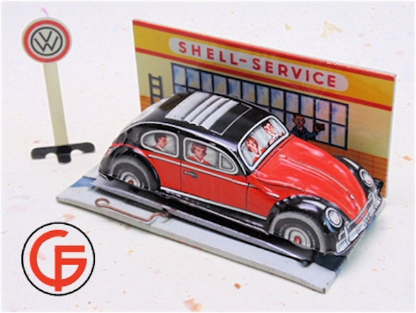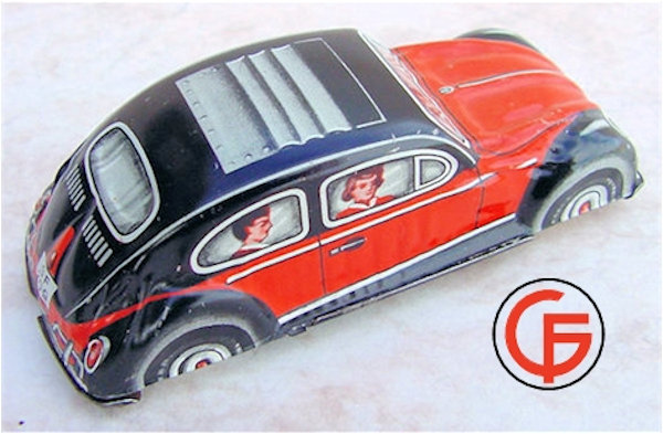 Tin body with a red & black color lithograph VW Sedan design with sunroof and license plate number GF-209. People’s faces in the windows. Tin chassis with or without a friction motor.