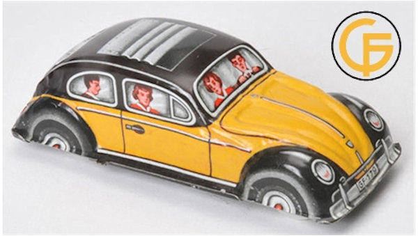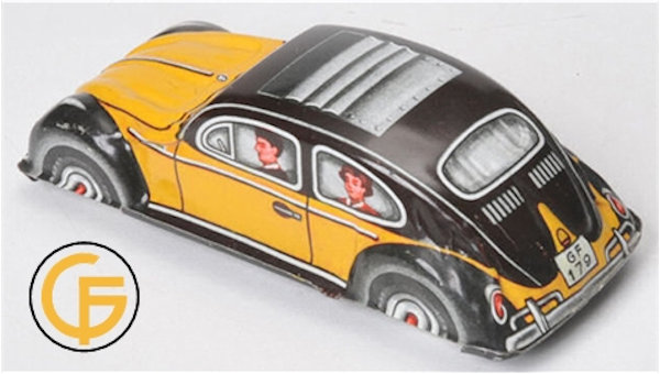 Tin body with a yellow & black color lithograph VW Sedan design with sunroof and license plate number GF-179.