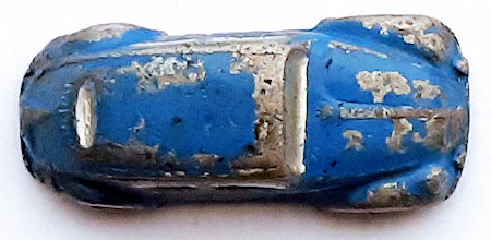 Solid white metal casted body with the resemblance of an Oval Window VW Sedan was produced by INDUSTRIAS SYDNEY (SID) Mexico. The casting is somewhat on the crude side but details of the front hood, rear hood, headlights, taillights, rear oval window and louvers can be seen. There is casted a VW emblem for the front hood. The front and rear bumpers with guards are also part of the body casting. There is a dab of silver paint for the headlights, front and rear bumpers as well. Metal axles with black plastic wheels are present and it appears that the thin metal chassis, holding them in place, is glued to the body. The chassis is stamped SID. Just to mention, SID also produced a top down Cabrio VW that was similar, see INDUSTRIAS SIDNEY SID VW CONVERTIBLE.