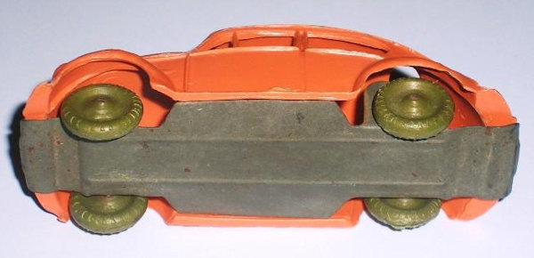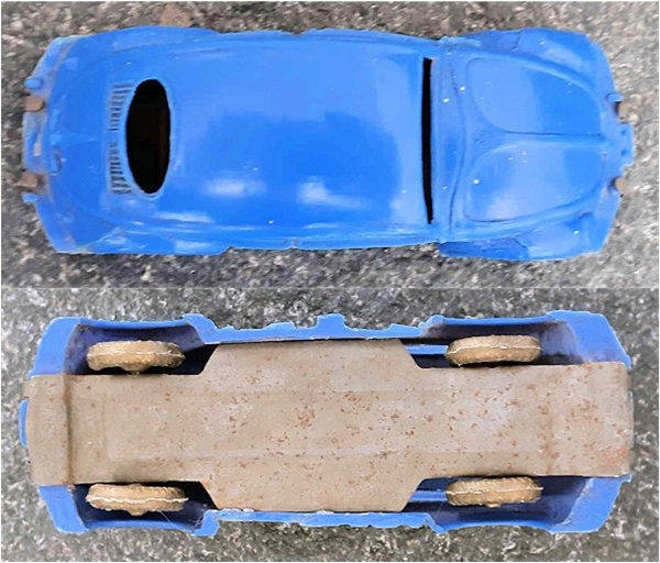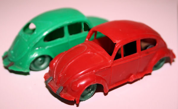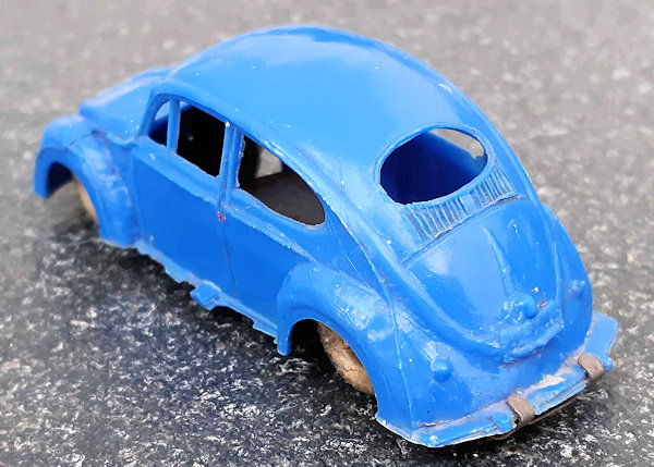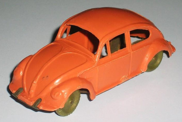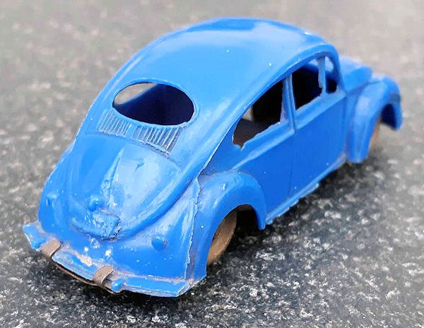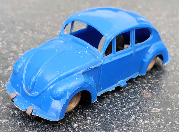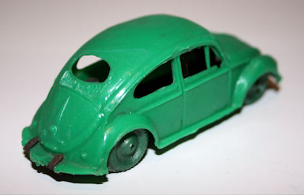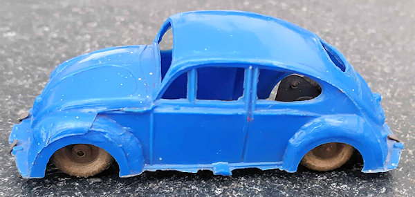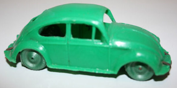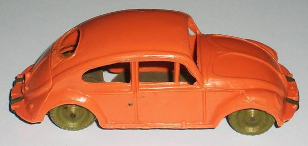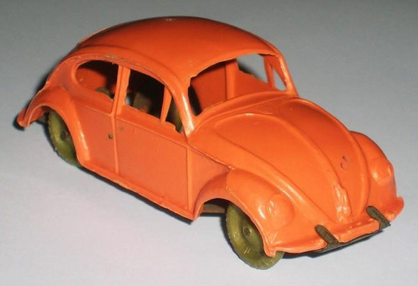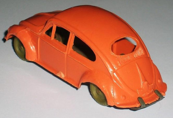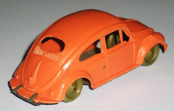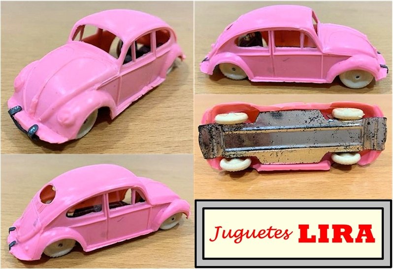 This Oval Window Volkswagen Sedan was produced by LIRA in Ibi Alicante, Spain. LIRA produced plastic toys, but only one toy car is known by them with 100% certainty, the Oval Volkswagen Beetle. There are some rumors about a Citroen DS19 model also. The LIRA Oval beetle was produced in 2 sizes. Please also look at LIRA OVAL VW V3.