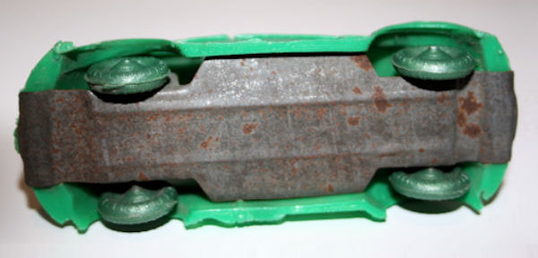 One piece plastic body with cut out windows, metal axles, plastic wheels and good details of front and rear hood, door seams and rear oval window. The tin chassis has two seam lines running the length of the chassis for strength. This LIRA V2 has NO flywheel motor. There are no markings. This LIRA V2 has a dull finish plastic body.