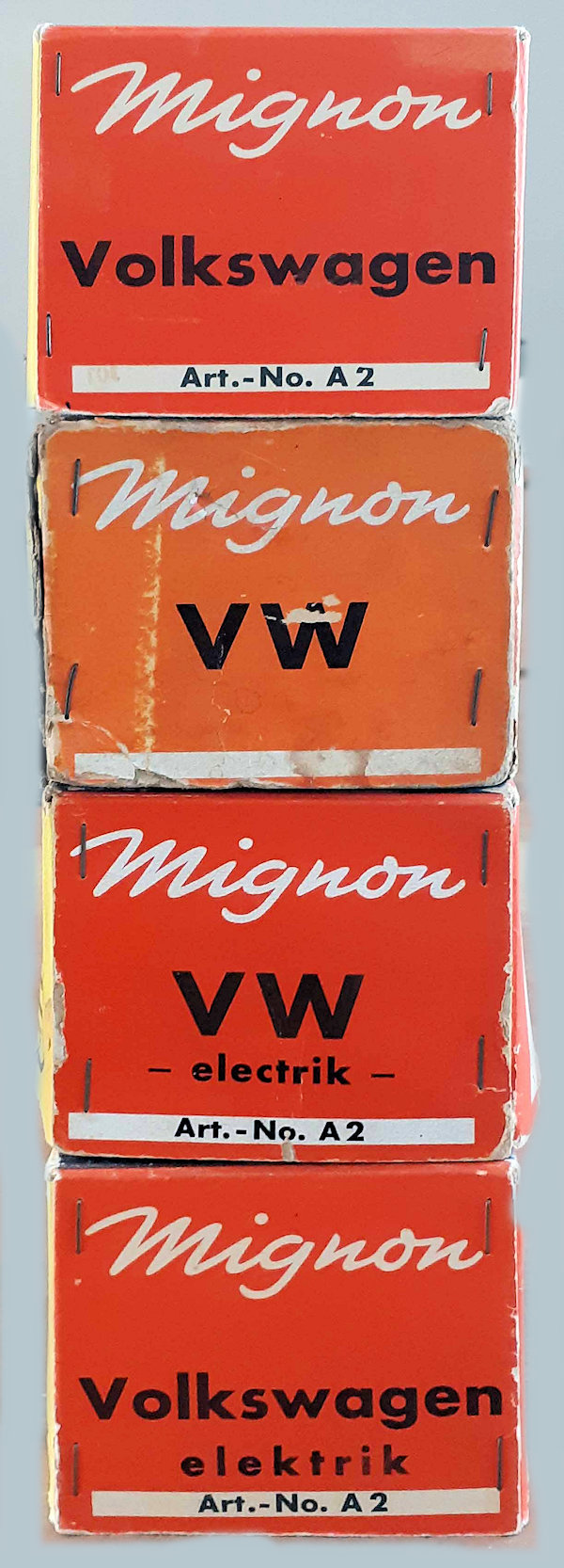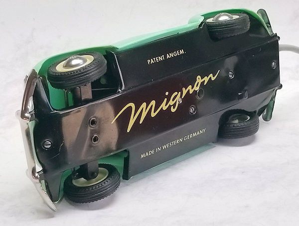 This remote control Oval Window VW was produced by R. & W. Link from Schwenningen under the brand name MIGNON. LINK bought in 1951 the name and trademark “MIGNON” of the Staiger Company. LINK started producing the toys with cable steering. LINK was in principle a mechanical company, produced the tin parts themselves as well as the technical parts of a toy. The body was bought from other manufacturers: the Oval VW had an Arnold body. R&W LINK / MIGNON did not advertise anymore after 1957. It is unclear when the Company ceased to exists. Most probably that was around 1958/1959.