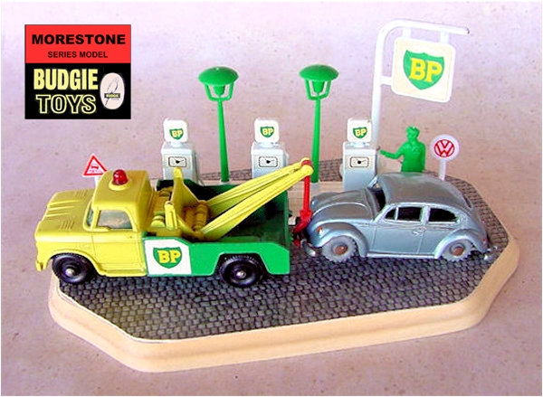 In the 1940’s, MORRIS and STONE were a small Stoke Newington, London based wholesale toy company. They distributed toys for many small toy manufacturers. Later the company name was changed into MORESTONE and in the mid 1950’s they introduced a range called the “Esso Petrol Pump” series to compete with Lesney 1-75 range. In 1961 MORESTONE was taken over by S. Guiterman & Co and the name was changed again into BUDGIE TOYS. They went bankrupt in 1966 and MODERN PRODUCTS bought the BUDGIE trademark and continued production.