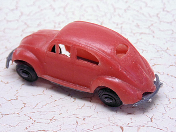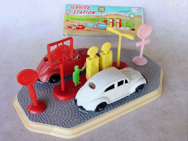Plastic body with cut out windows and fair details of front and rear hood, door seams and rear oval window with air louvers. Chassis molded in grey plastic and black plastic wheels attached to the chassis. Chassis has dots around the edge like little rivets. Part of a filling station set with pumps, signs and station attendant. Believed to be produced by PH, Paya Hermanos.