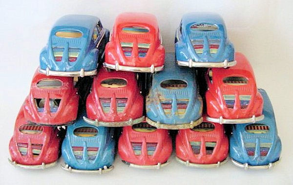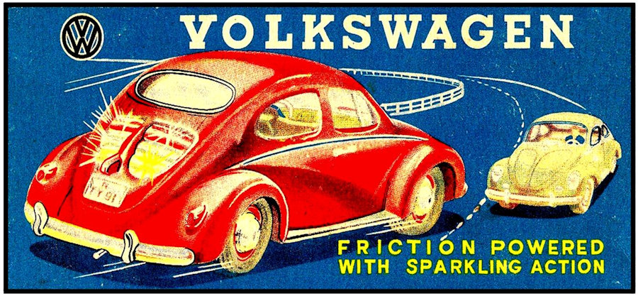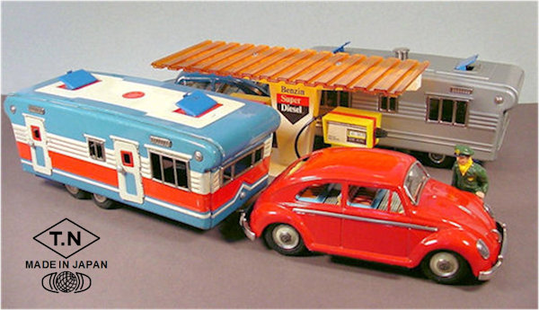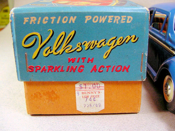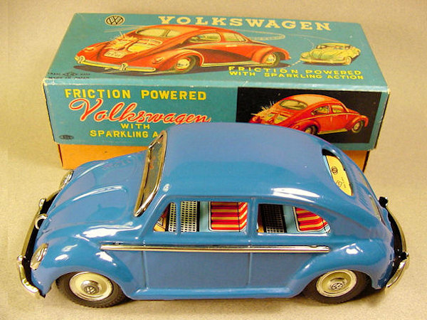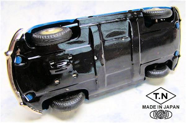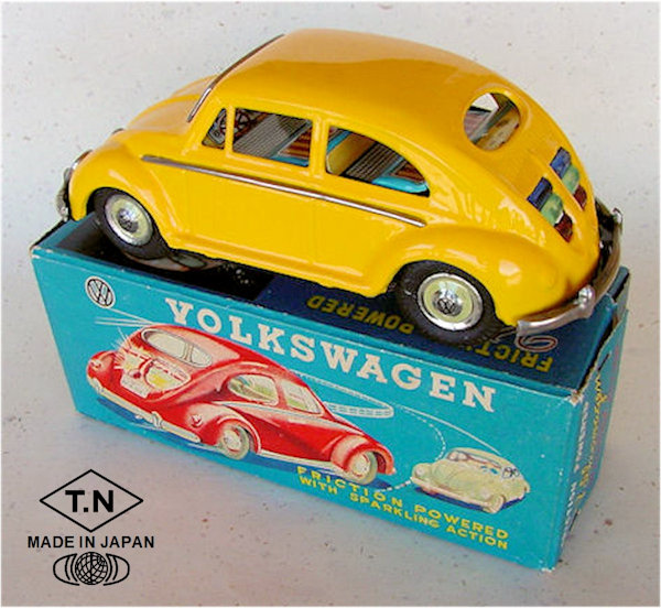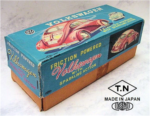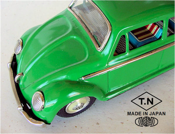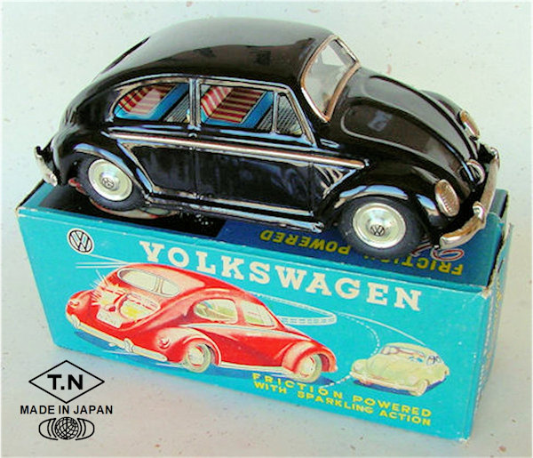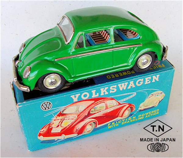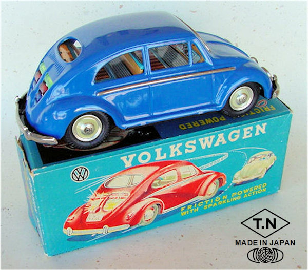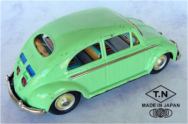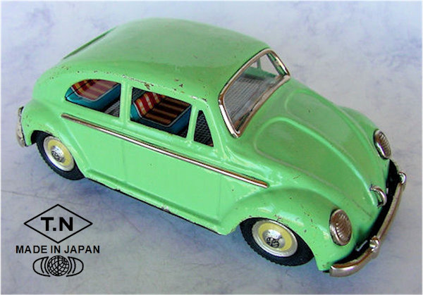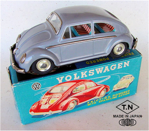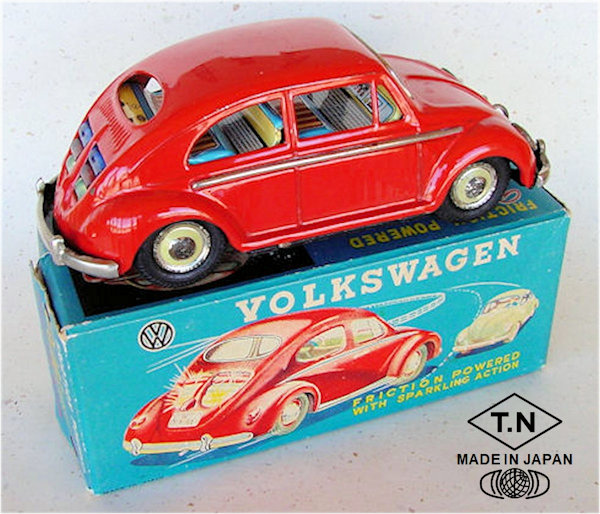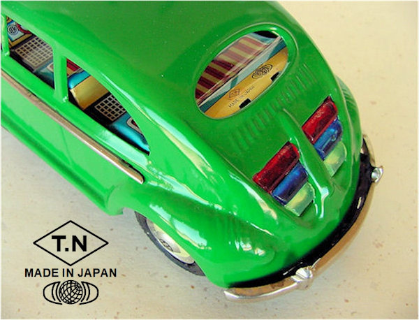 TOY NOMURA produced this nice size Oval Window VW toy as a tin body with cut out windows and very good details of front and rear hood, door seams and rear oval window with air louvers. Small tin body parts include headlights, hood handle, windshield trim, and side trim. The tin lithograph interior was not that of a VW design. Rear deck lid has three plastic colored slats. Tin chassis with bumpers and a friction motor with a flint sparkler seen through the plastic rear deck lid slats. Rubber tires with VW hubcaps. The T.N insignia may or may not be printed on the interior seen through the rear oval window. The red, blue and grey are the common colors with the other colors seldom found. Similar to the tin ALPS Oval Window Volkswagen.