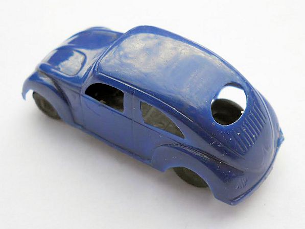 Green plastic body with cut out windows and fair details of front and rear hood, door seams and rear oval window with air louvers. Chassis molded in black plastic with black plastic wheels on metal axles attached to the chassis. Chassis attached to the body with glue. Chassis has the manufacturer logo of a circle with VSM inside and MADE IN ITALY under the circle.