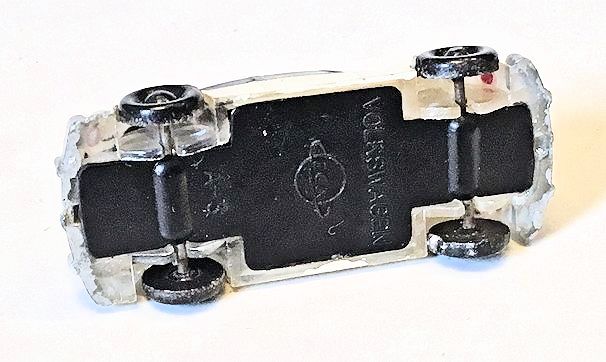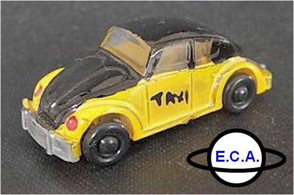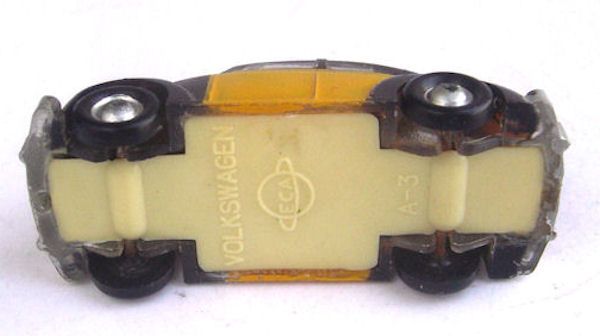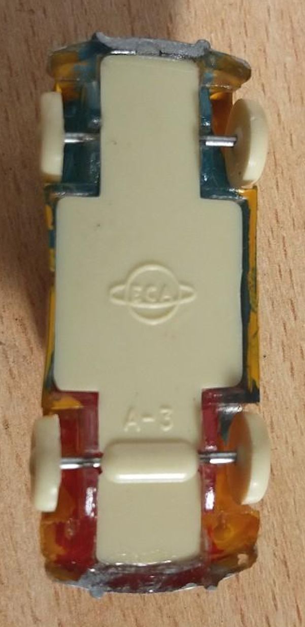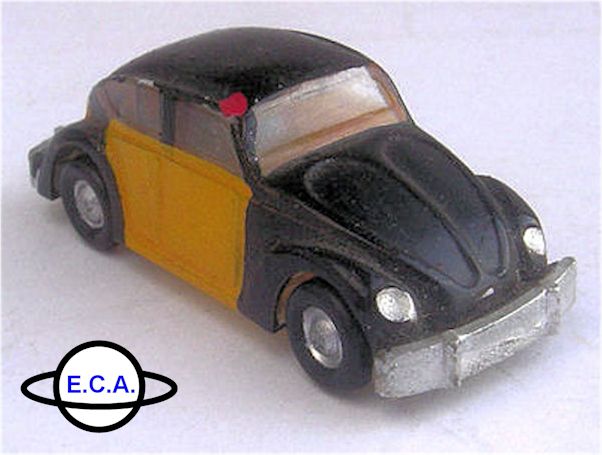 One piece plastic model with plastic clear windows. The body seems to exists of clear plastic, which has been painted by hand. Metal axles with plastic wheels on a beige or black chassis. The first model shown is a Barcelona Taxi (typical yellow and black coloring) from the early fifties. On the chassis it reads “Volkswagen”, the ECA logo and “A-3”.