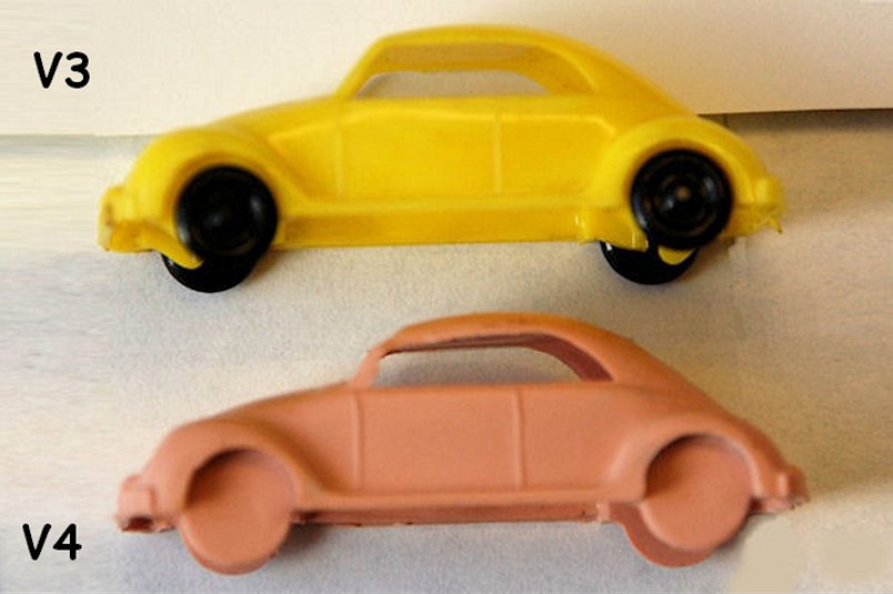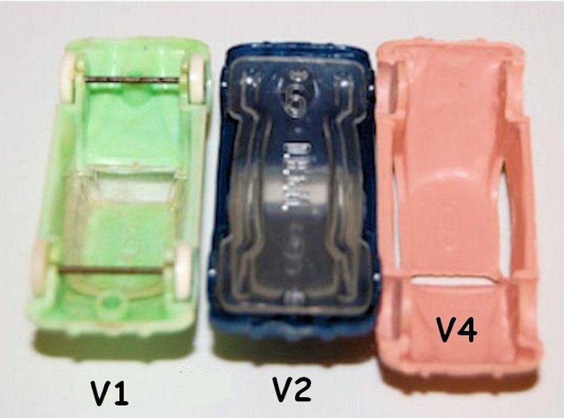 In the 1950's they produced 2 split window beetle versions in hard plastic; Hammer V1 without chassis, but with black plastic wheels on metal axles and Hammer V2 with wheels as a part of the body, no axles and a clear plastic chassis.