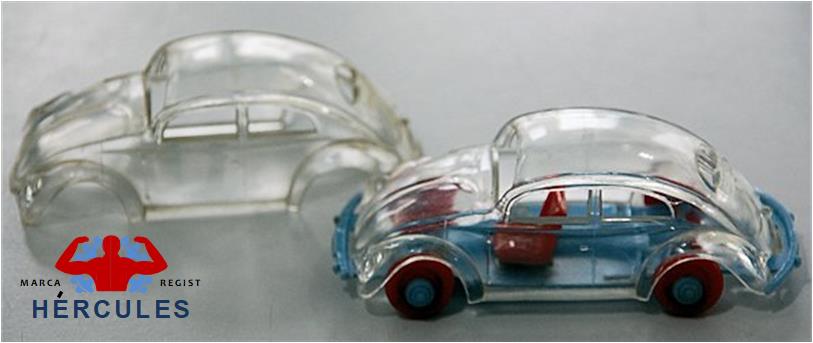 Very detailed clear plastic body with cut out windows. Plastic chassis contained separate parts to include spare tire, gas tank, seats, steering wheel, engine/transmission. Plastic wheels attached to the chassis with hubcaps. This was a constructional kit.