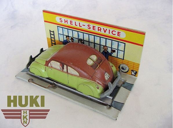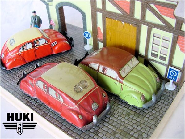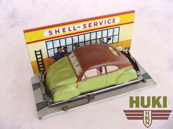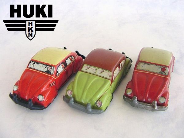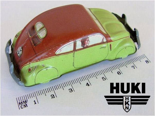 In 1910, Hubert Kienberger founded HUKI, Kienberger & Co., Nürnberg, Germany. They mainly produced Penny Toys and animals on wheels. Before WWII, they used the brand name KiCo, which was later altered into HUKI. In 1943 the Company was destroyed by a fire and only in 1951 production was restarted. Huki seized to exist in the second half of the seventies. Huki always produced tintoys and did not change to plastic cars like many other manufacturers. This caused their downfall. They had developed new toymodels until the late sixties; in their last decade ( or less) they only produced from their old molds....