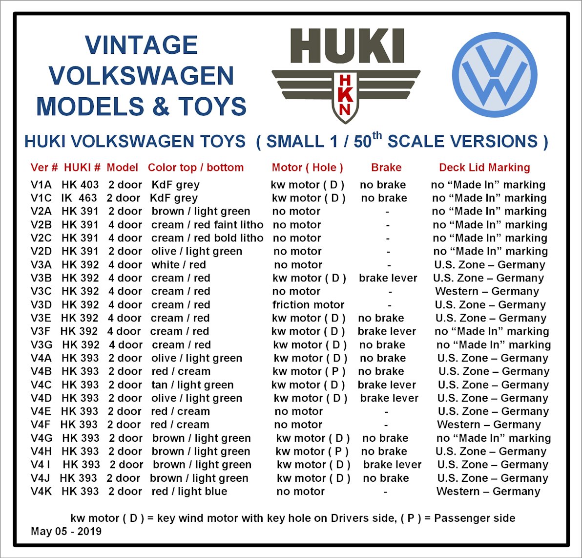 Very nice tinplate lithograph body representing the Volkswagen. Details include windows with peoples faces, taillights, headlights and engine louvers. License registration number HK391 rear deck lid. The HK391 was produced with a 2 door or 4 door sedan design, no motor and no “Made In” markings on the rear deck lid. Tin chassis with metal wheels and bumpers, variation with black chassis and bumpers. See chart for variations.