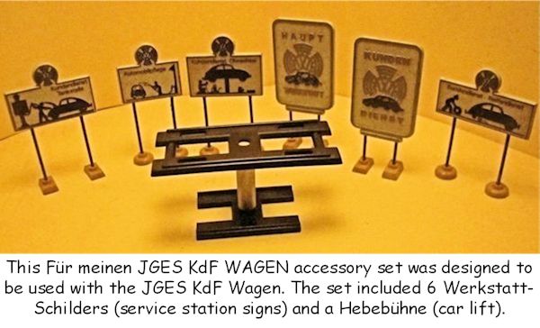 This Für meinen JGES KdF WAGEN accessory set was designed to be used with the JGES KdF Wagen. The set included 6 Werkstatt-Schilders (service station signs) and a Hebebühne (car lift). The signs depicted the KdF Wagen getting service with a tire change, washing, engine repair and fueling. Two signs indicated the main service and repair location. The car lift could be raised and lowered and could have a JGES MEIN KdF WAGEN sitting on top of the lift for service. The accessory set did not include the JGES KdF WAGEN.