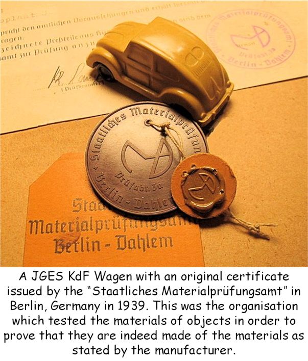 In the late autumn of 2014, a JGES KdF Wagen with an original certificate issued by the “Staatliches Materialprüfungsamt” in Berlin, Germany in 1939 (the organisation which tested the materials of objects in order to prove that they are indeed made of the materials as stated by the manufacturer) was offered on eBay. This caused a great shock and also some disbelief among collectors. This would mean that JGES was already producing a pre-war (WWII) version VW!