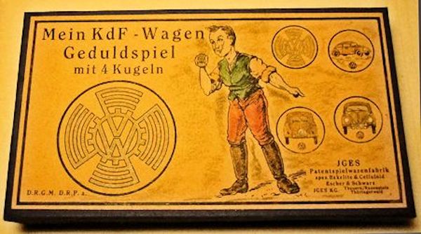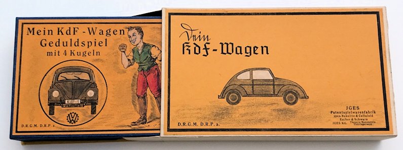This JGES MEIN KdF WAGEN is a Geduldspiel or puzzle in a small round Bakelite container. It came in 4 different sets and each set included a puzzle, pencil, score card and an eraser. The puzzle had a frontview of a KdF Wagen era picture inside the Bakelite container with 4 small holes and 4 metal balls. Also a version with just the VW logo with cogwheel, a KdF Wagen from sideview and a KdF Wagen from rearview. The object of the game was to move the 4 balls until they each landed into a small hole on the picture. Not sure how the scoring was determined.