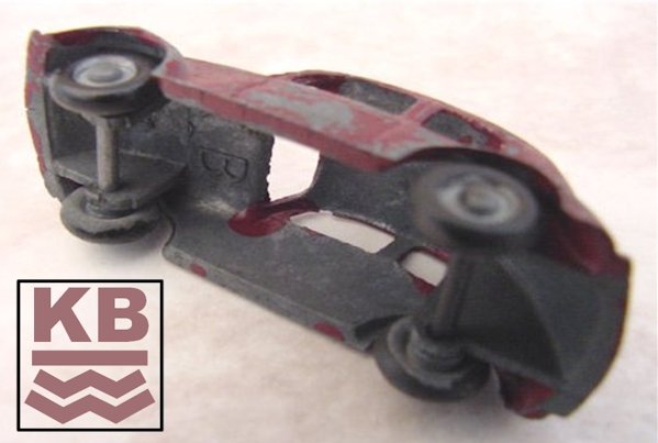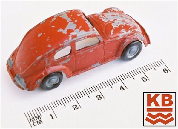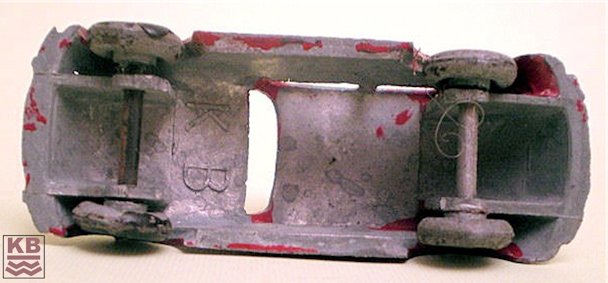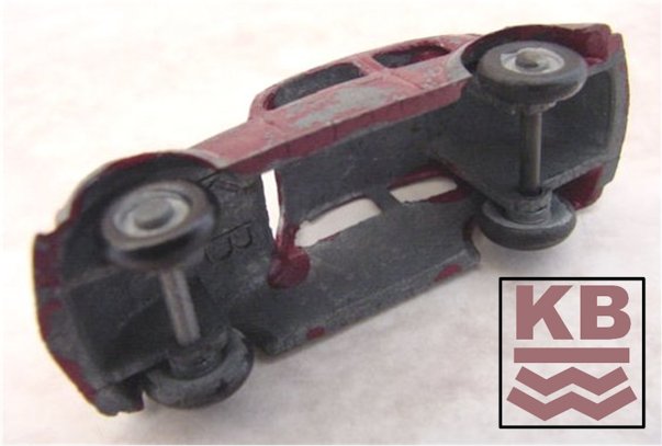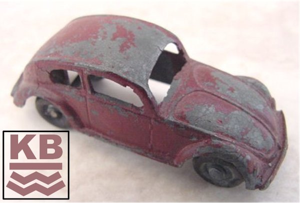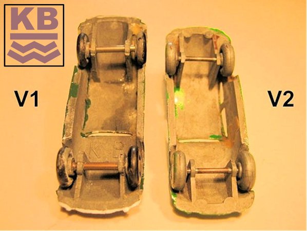 Shown is a diecast KdF Wagen with cut out windows except for the rear window area that is solid (no Split Window visible). Details of the front and rear hoods and doors. No chassis and metal wheels with axles secured to the body posts. It has “KB” inside the roof. V1 & V2 are very similar - see photos.