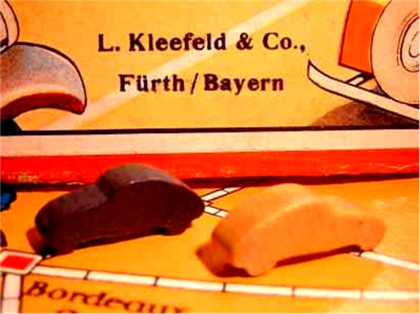 Solid piece of wood cut out into the shape of a Volkswagen Sedan. Painted various colors and was used as a game piece for a game set Auf der Autostrassen durch Europa. Box art work produced in three versions.