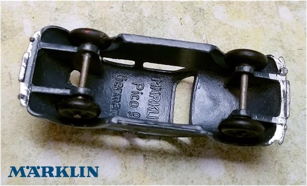 Zinc diecast body with cut out windows and details of the front and rear hood, doors, headlights and taillights. No chassis, plastic wheels on metal axles and inside the body is stamped “MÄRKLIN Pico 9 Germany” and “KdF” cast on front and rear bumpers. MÄRKLIN catalog number reference No. Pico 9 and box number of 5519/9. Over the years, the diecast metal becomes very brittle and can easily break with temperature change and handling.