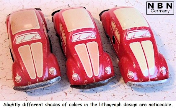 Nürnberger Blechspielwarenfabrik (NBN) produced this Volkswagen toy in a two-tone red or green tin plate lithographed body with white striping for the windows, doors, front hood, headlights, taillights, split window and louvers. Front hood and top either light green or cream.
