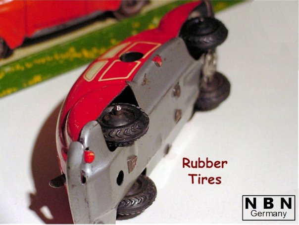 Metal chassis includes bumpers, a clockwork motor and steel button wheels. “MADE IN US ZONE GERMANY” printed under the rear hood and these VWs were part of a track set. A picture of this VW (229/1) is shown in an NBN toy sales catalog. The red version also came with large rubber wheels as well as with a slightly different lithography with the cream white body parts are a very light red instead. Very rarely seen is a non two-tone solid green color with lithographed faces on the windows.