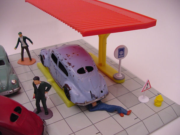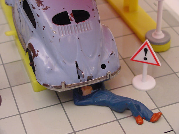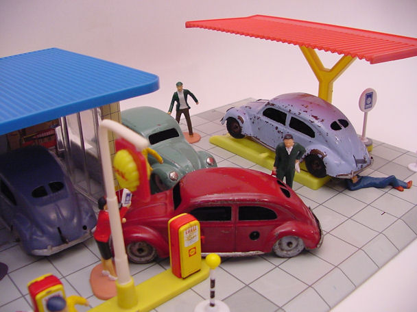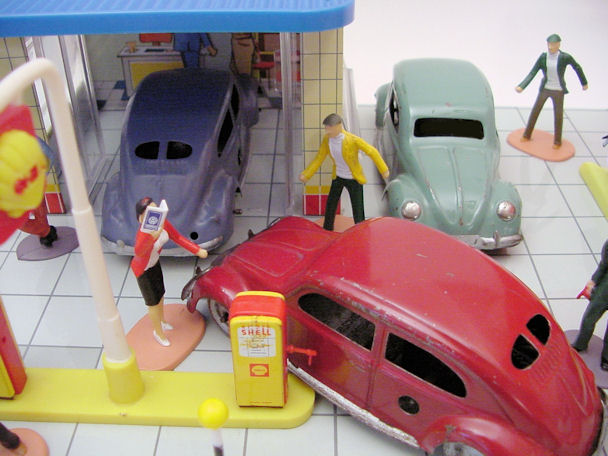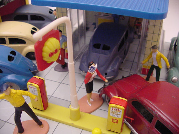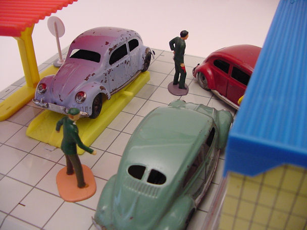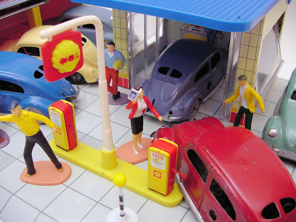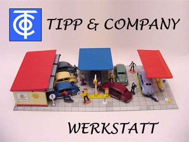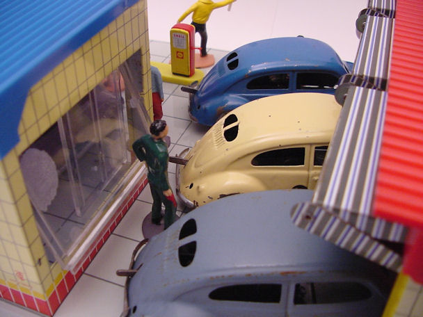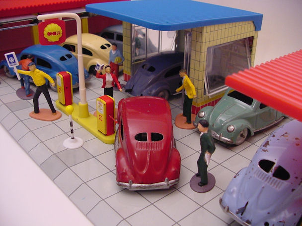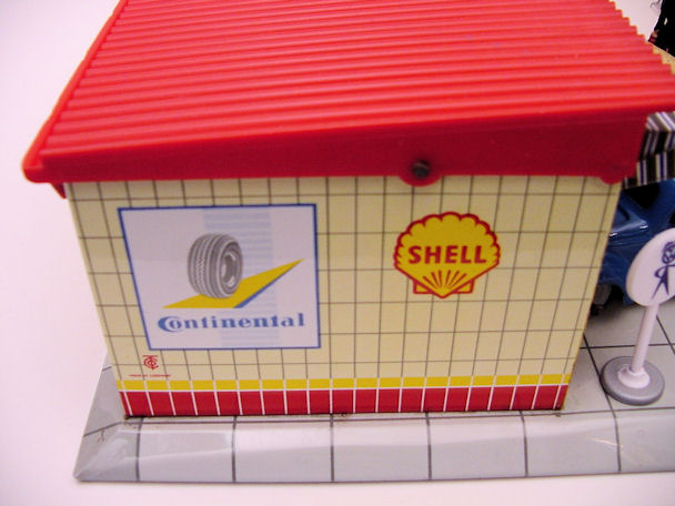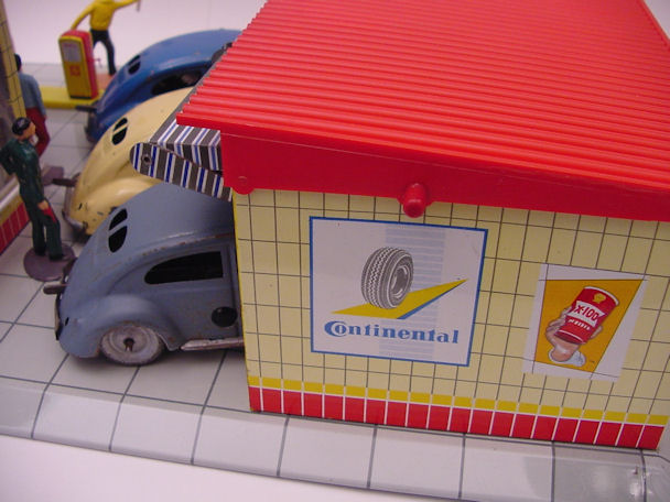 The TIPPCO fuel pump station was also redesigned and the platform was made smaller. Lithograph variations in the cobblestone have been noted as well. The special ratchet and lever built into the fuel pump remained the same. There was also a map sign showing the autobahn and a footstool mounted to the platform base.