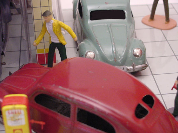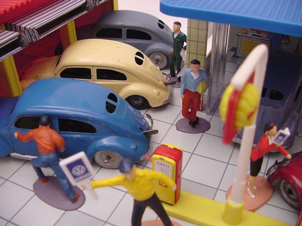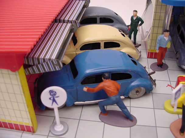 TIPPCO not only made the awesome little pump stations for their line of tin toys but also made other accessories. Those accessories included garages and werkstatts. The colorful garages appeared during the WWII era and are stamped with the TIPPCO “TCO” insignia and “Made in Germany” in the lithograph design. The garages are really cool and feature tin garage doors that are spring loaded and fold up in the middle when touched. The garages usually have three doors and were sold separately. TIPPCO introduced many versions and variations to their accessory product line. Later in the 1950s, garages were attached to tin lithographed platforms that had the appearance of concrete bricks. The platform sizes ranged from the basic garage and tankstelle to the “Super Deluxe” set consisting of a garage, tankstelle, office and lift platform with shade cover. The TIPPCO “Super Deluxe” set is featured in this article. This werkstatt set is in remarkably mint condition considering it was made in the 1950s and time has definitely stood still for it. You can see the photos the details of the beautiful tin litho garage with those folding doors mounted unto the concrete looking base plate. The office area with the clear plastic windows and doors. There are two gas pumps and a SHELL sign mounted in the middle of the pumps. The lift platform raises up with a VW on it for service. The shade cover for the lift is very fragile and the yellow post is not made very strong. I am surprised it has lasted more than one day after being under a Christmas tree or birthday celebration. I have placed from my VW collection the 1/30th scale cars for this werkstatt diorama. If you look close at the photos, you can see and identify the different versions of the TIPPCO Split VWs as mentioned in this article. There are also some figures to make the place look busy. As with most of the TIPPCO VWs and accessory items produced in the 1940s and 1950s era, they have become collector’s items and are very hard to locate and can be quite pricey. Sometimes they can be found at online auctions or at antique toy shows.