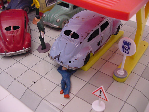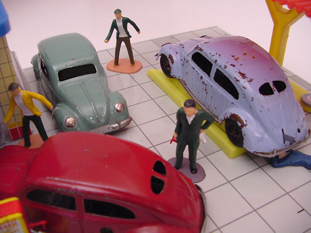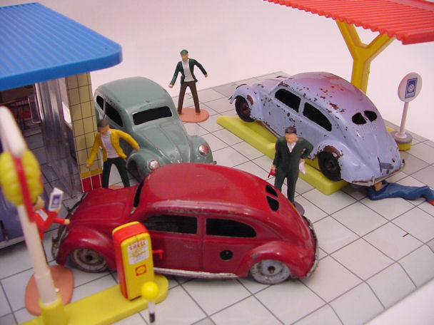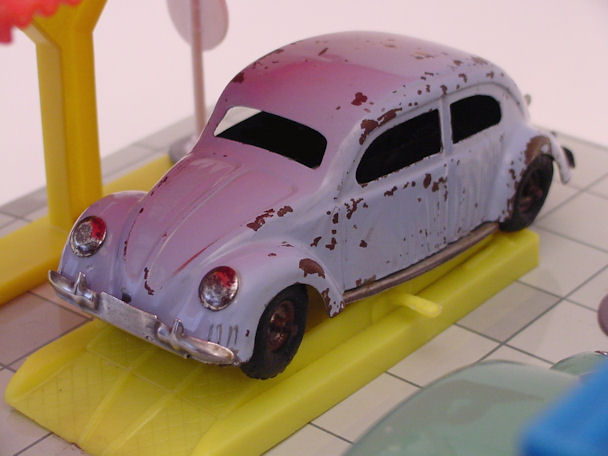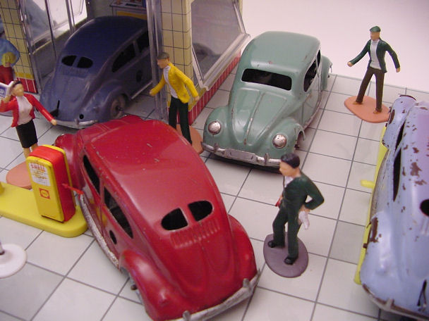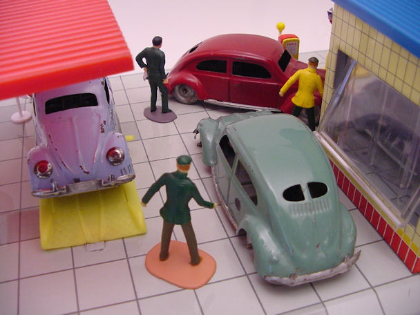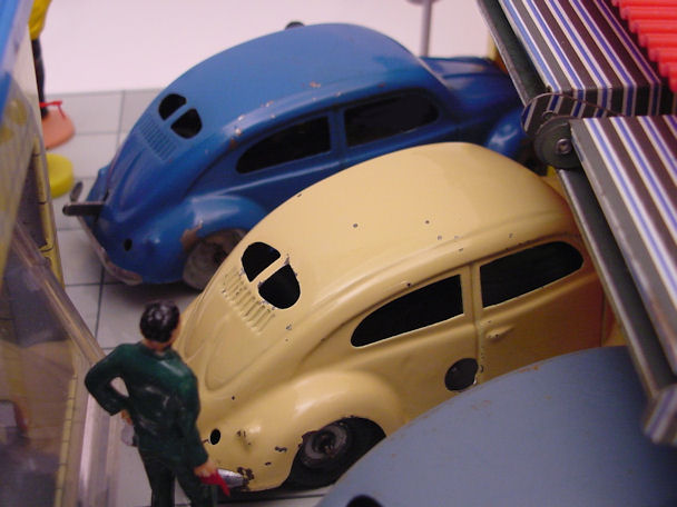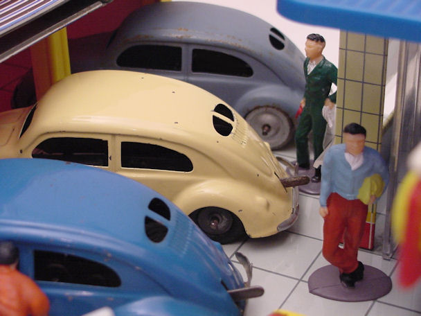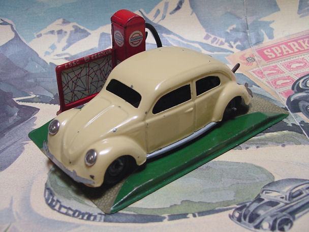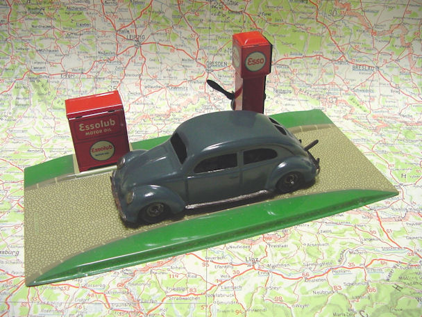 Fortunately enough for the Volkswagen toy collectors, TIPPCO was right there in the era of the KdF Wagen (war time Volkswagen) and produced a Reichsautobahn track set that included a 1940 KdF Wagen. The Reichsautobahn was a lithographed tin toy set with colorful tracks, cars, bridges and a tankstelle (gas pump station) with a clever wind up mechanism for winding up the clockwerk motors in the cars. The 1/44th scale (93mm in length) KdF Wagen toy in the set was lithographed the official KdF blue/gray color and had peoples faces printed in the windows. This was typical of the KdF era in which the KdF brochures and German postage stamps depicted a happy family driving down the autobahn in their KdF Wagen. These autobahn track sets were produced after the war and were sold in sets of various sizes. From the basic entry level set to the complex set of numerous tracks, trestles and bridges.