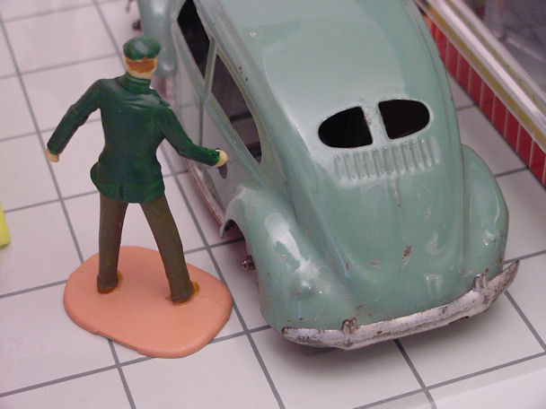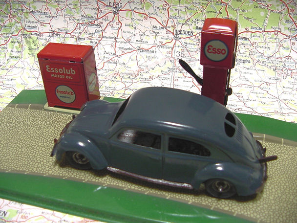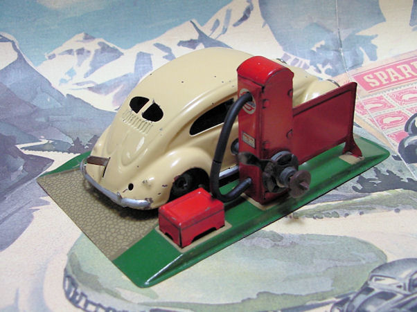 There is a small hole in the right rear fender of the TIPPCO KdF Wagen body. TIPPCO produced a special tin plate "ESSO" or "STANDARD" tankstelle or fuel stop platform accessory. The KdF Wagen was driven onto the colorful lithographed platform (cobblestone looking base) to simulate a fuel stop. A shaft extended from the red lithographed tin fuel pump, into the keyhole at the side of the KdF body, and connected to the shaft of the clockwork motor. The clockwork motor was then wound up by using the special ratchet and lever built into the fuel pump. Also located on the fuel pump is a rubber hose with a metal nozzle. The nozzle fits into a small hole in the rear fender of the toy to help simulate a real fuel stop, although we all know the VW fuels from the front. TIPPCO also produced other tin vehicles such as a Mercedes and Opel that also used this fuel station so the rear fueling was appropriate. The fuel pump platform came in a couple of variations that included an oil container, lithographed map sign and a foot stool to step on when cleaning the windows. The fuel stop platform was also stamped “MADE IN GERMANY” in the lithograph design.